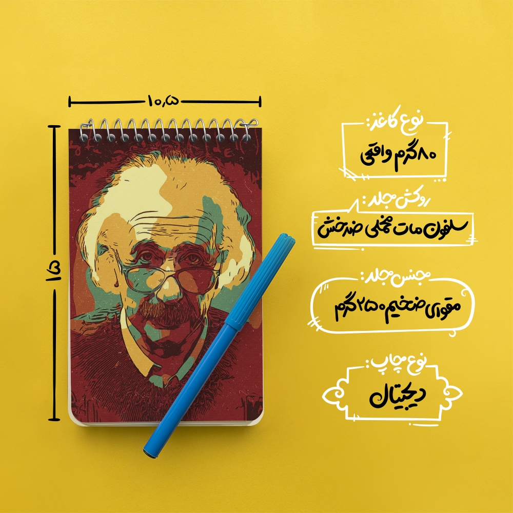 برند خندالو در زمینه تولید انواع دفاتر فانتزی و تحصیلی فعالیت میکند که به دلیل جذابیت ظاهری و طرح های متنوع طرفداران زیادی دارد. دفتر یادداشت خندالو طرح آلبرت اینشتین محصولی مناسب برای همه عاشقان لوازم التحریر است و همچنین همه کسانی که بنا به موقعیت تحصیل یا شغلشان با دفتر و نوشت افزار زیاد سر و کار دارند. در تولید دفتر یادداشت خندالو طرح آلبرت اینشتین از نوع صحافی فنر مارپیچ استفاده شده که در این نوع صحافی برگهها به راحتی چرخیده و یا بیرون آورده می شوند. دفتر های خندالو دارای جلد انعطاف پذیر از جنس مقوای گلاسه 250 گرم با روکش سلفون مات مخملی است که به شما امکان میدهد از دفتر خود بدون اینکه نگرانی از شکستن یا خراب شدن جلد را داشته باشید استفاده کنید و همچنین در این دفاتر از کاغذ 80 گرم با کیفیت استفاده شده که باعث میشود هنگام نوشتن به خوبی جوهر قلم بر روی صفحه نشسته و از خط خوردگیها جلوگیری کند. دفتر یادداشت خندالو با جنس و دوام مناسب، برگه های کاملاً سفید و خطوط طوسی دقیق را داراست که انسان را به نوشتن منظم و زیبا ترغیب میکند. طراحی کاملاً مناسب این دفاتر، به همراه کیفیت بالا، از آن یک محصول مورد علاقه و قابل اعتماد برای همه مقاطع تحصیلی میسازد. دفتر یادداشت خندالو طرح آلبرت اینشتین انتخابی هوشمندانه و مناسب برای افرادی است که به دنبال دفتری با کیفیت و کاربرد عالی هستند. این دفتر، همراه خوبی برای شما در تمام مراحل تحصیل و کار خواهد بود و تجربهای لذتبخش از نوشتن و آموختن را به شما هدیه میدهد.