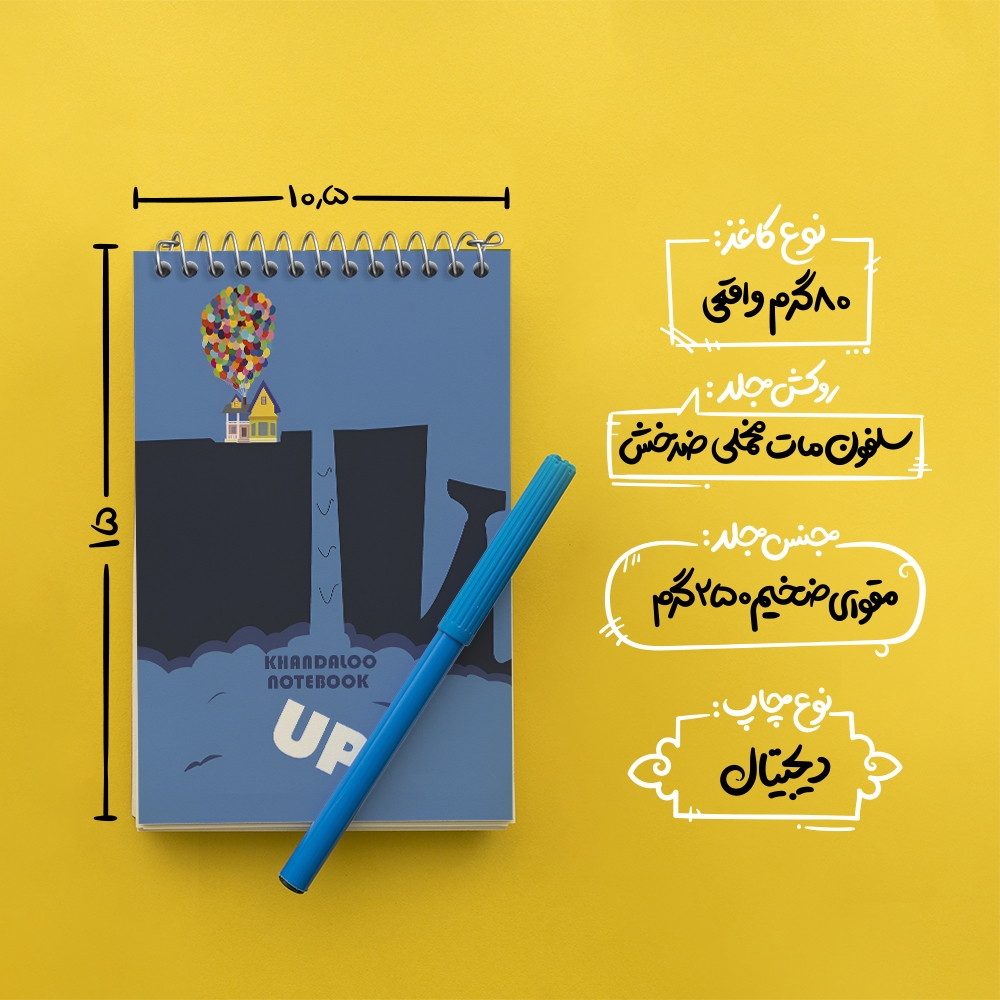 برند خندالو در زمینه تولید انواع دفاتر فانتزی و تحصیلی فعالیت میکند که به دلیل جذابیت ظاهری و طرح های متنوع طرفداران زیادی دارد. دفتر یادداشت خندالو طرح آپ (Up) محصولی مناسب برای همه عاشقان لوازم التحریر است و همچنین همه کسانی که بنا به موقعیت تحصیل یا شغلشان با دفتر و نوشت افزار زیاد سر و کار دارند. در تولید دفتر یادداشت خندالو طرح آپ (Up) از نوع صحافی فنر مارپیچ استفاده شده که در این نوع صحافی برگه‌ها به راحتی چرخیده و یا بیرون آورده می شوند.