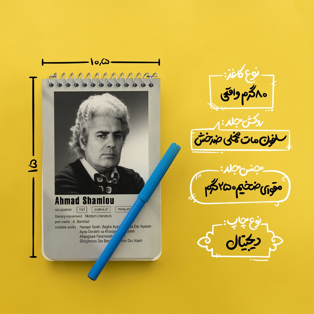 برند خندالو در زمینه تولید انواع دفاتر فانتزی و تحصیلی فعالیت میکند که به دلیل جذابیت ظاهری و طرح های متنوع طرفداران زیادی دارد. دفتر یادداشت خندالو طرح احمد شاملو محصولی مناسب برای همه عاشقان لوازم التحریر است و همچنین همه کسانی که بنا به موقعیت تحصیل یا شغلشان با دفتر و نوشت افزار زیاد سر و کار دارند. در تولید دفتر یادداشت خندالو طرح احمد شاملو از نوع صحافی فنر مارپیچ استفاده شده که در این نوع صحافی برگهها به راحتی چرخیده و یا بیرون آورده می شوند. دفتر های خندالو دارای جلد انعطاف پذیر از جنس مقوای گلاسه 250 گرم با روکش سلفون مات مخملی است که به شما امکان میدهد از دفتر خود بدون اینکه نگرانی از شکستن یا خراب شدن جلد را داشته باشید استفاده کنید و همچنین در این دفاتر از کاغذ 80 گرم با کیفیت استفاده شده که باعث میشود هنگام نوشتن به خوبی جوهر قلم بر روی صفحه نشسته و از خط خوردگیها جلوگیری کند. دفتر یادداشت خندالو با جنس و دوام مناسب، برگه های کاملاً سفید و خطوط طوسی دقیق را داراست که انسان را به نوشتن منظم و زیبا ترغیب میکند. طراحی کاملاً مناسب این دفاتر، به همراه کیفیت بالا، از آن یک محصول مورد علاقه و قابل اعتماد برای همه مقاطع تحصیلی میسازد. دفتر یادداشت خندالو طرح احمد شاملو انتخابی هوشمندانه و مناسب برای افرادی است که به دنبال دفتری با کیفیت و کاربرد عالی هستند. این دفتر، همراه خوبی برای شما در تمام مراحل تحصیل و کار خواهد بود و تجربهای لذتبخش از نوشتن و آموختن را به شما هدیه میدهد.