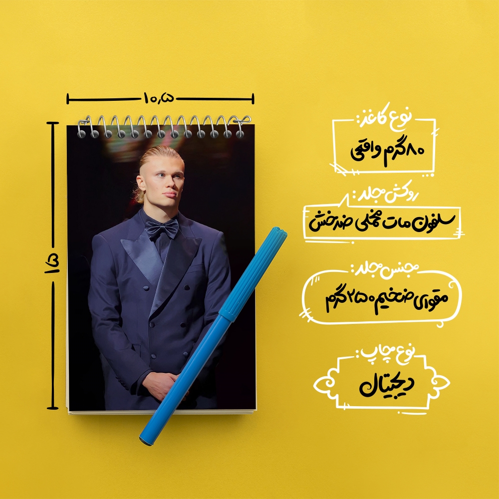 برند خندالو در زمینه تولید انواع دفاتر فانتزی و تحصیلی فعالیت میکند که به دلیل جذابیت ظاهری و طرح های متنوع طرفداران زیادی دارد. دفتر یادداشت خندالو طرح ارلینگ هالند (Erling Haaland) محصولی مناسب برای همه عاشقان لوازم التحریر است و همچنین همه کسانی که بنا به موقعیت تحصیل یا شغلشان با دفتر و نوشت افزار زیاد سر و کار دارند. در تولید دفتر یادداشت خندالو طرح ارلینگ هالند (Erling Haaland) از نوع صحافی فنر مارپیچ استفاده شده که در این نوع صحافی برگهها به راحتی چرخیده و یا بیرون آورده می شوند. دفتر های خندالو دارای جلد انعطاف پذیر از جنس مقوای گلاسه 250 گرم با روکش سلفون مات مخملی است که به شما امکان میدهد از دفتر خود بدون اینکه نگرانی از شکستن یا خراب شدن جلد را داشته باشید استفاده کنید و همچنین در این دفاتر از کاغذ 80 گرم با کیفیت استفاده شده که باعث میشود هنگام نوشتن به خوبی جوهر قلم بر روی صفحه نشسته و از خط خوردگیها جلوگیری کند. دفتر یادداشت خندالو با جنس و دوام مناسب، برگه های کاملاً سفید و خطوط طوسی دقیق را داراست که انسان را به نوشتن منظم و زیبا ترغیب میکند. طراحی کاملاً مناسب این دفاتر، به همراه کیفیت بالا، از آن یک محصول مورد علاقه و قابل اعتماد برای همه مقاطع تحصیلی میسازد. دفتر یادداشت خندالو طرح ارلینگ هالند (Erling Haaland) انتخابی هوشمندانه و مناسب برای افرادی است که به دنبال دفتری با کیفیت و کاربرد عالی هستند. این دفتر، همراه خوبی برای شما در تمام مراحل تحصیل و کار خواهد بود و تجربهای لذتبخش از نوشتن و آموختن را به شما هدیه میدهد.