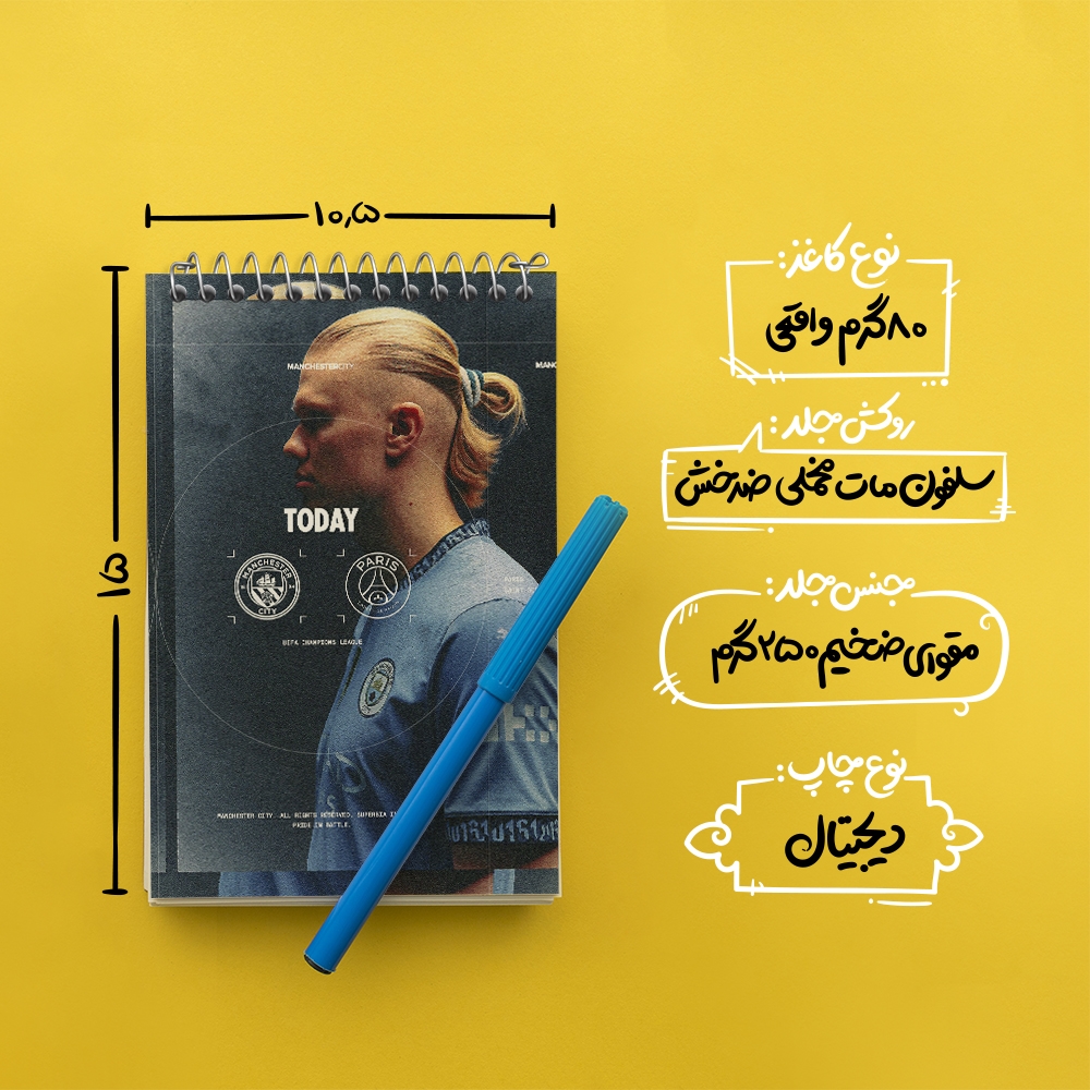 برند خندالو در زمینه تولید انواع دفاتر فانتزی و تحصیلی فعالیت میکند که به دلیل جذابیت ظاهری و طرح های متنوع طرفداران زیادی دارد. دفتر یادداشت خندالو طرح ارلینگ هالند (Erling Haaland) محصولی مناسب برای همه عاشقان لوازم التحریر است و همچنین همه کسانی که بنا به موقعیت تحصیل یا شغلشان با دفتر و نوشت افزار زیاد سر و کار دارند. در تولید دفتر یادداشت خندالو طرح ارلینگ هالند (Erling Haaland) از نوع صحافی فنر مارپیچ استفاده شده که در این نوع صحافی برگهها به راحتی چرخیده و یا بیرون آورده می شوند. دفتر های خندالو دارای جلد انعطاف پذیر از جنس مقوای گلاسه 250 گرم با روکش سلفون مات مخملی است که به شما امکان میدهد از دفتر خود بدون اینکه نگرانی از شکستن یا خراب شدن جلد را داشته باشید استفاده کنید و همچنین در این دفاتر از کاغذ 80 گرم با کیفیت استفاده شده که باعث میشود هنگام نوشتن به خوبی جوهر قلم بر روی صفحه نشسته و از خط خوردگیها جلوگیری کند. دفتر یادداشت خندالو با جنس و دوام مناسب، برگه های کاملاً سفید و خطوط طوسی دقیق را داراست که انسان را به نوشتن منظم و زیبا ترغیب میکند. طراحی کاملاً مناسب این دفاتر، به همراه کیفیت بالا، از آن یک محصول مورد علاقه و قابل اعتماد برای همه مقاطع تحصیلی میسازد. دفتر یادداشت خندالو طرح ارلینگ هالند (Erling Haaland) انتخابی هوشمندانه و مناسب برای افرادی است که به دنبال دفتری با کیفیت و کاربرد عالی هستند. این دفتر، همراه خوبی برای شما در تمام مراحل تحصیل و کار خواهد بود و تجربهای لذتبخش از نوشتن و آموختن را به شما هدیه میدهد.