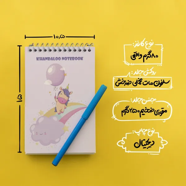 برند خندالو در زمینه تولید انواع دفاتر فانتزی و تحصیلی فعالیت میکند که به دلیل جذابیت ظاهری و طرح های متنوع طرفداران زیادی دارد. دفتر یادداشت خندالو طرح اسب تک شاخ (Unicorn) محصولی مناسب برای همه عاشقان لوازم التحریر است و همچنین همه کسانی که بنا به موقعیت تحصیل یا شغلشان با دفتر و نوشت افزار زیاد سر و کار دارند. در تولید دفتر یادداشت خندالو طرح اسب تک شاخ (Unicorn) از نوع صحافی فنر مارپیچ استفاده شده که در این نوع صحافی برگه‌ها به راحتی چرخیده و یا بیرون آورده می شوند.