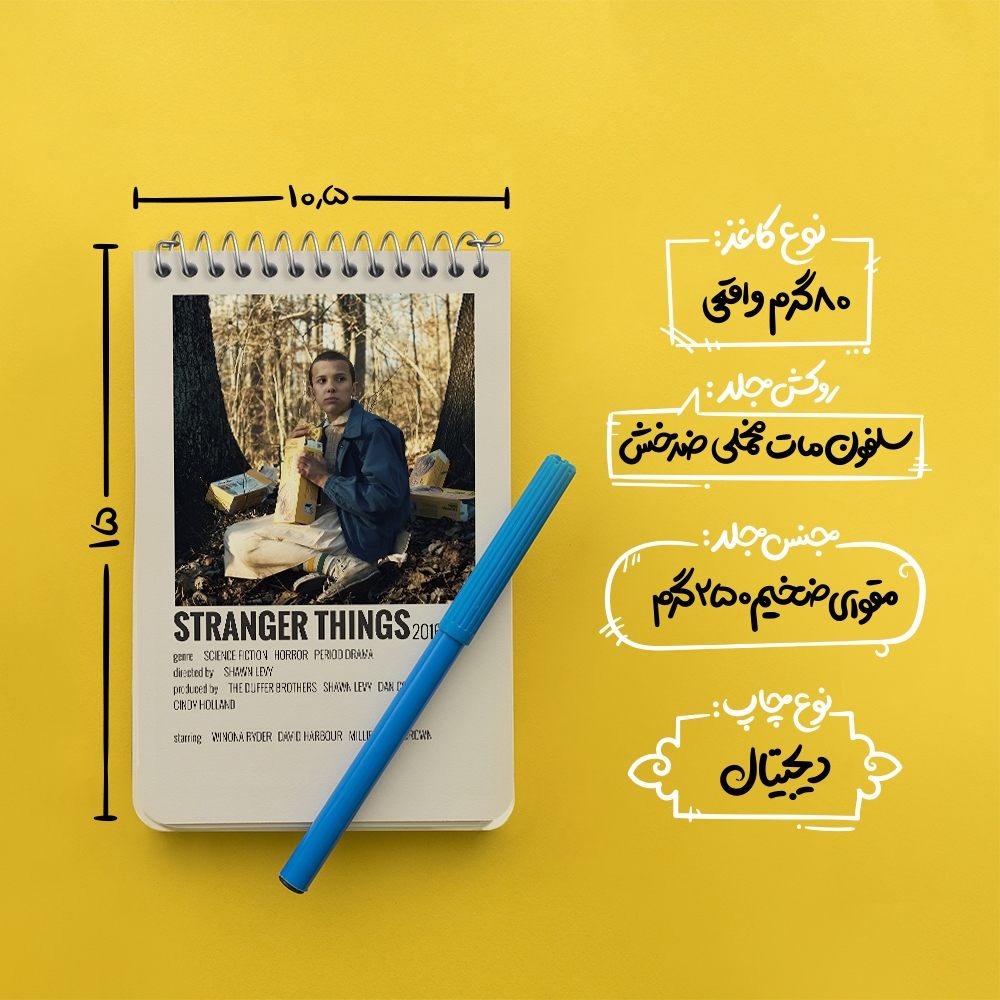 برند خندالو در زمینه تولید انواع دفاتر فانتزی و تحصیلی فعالیت میکند که به دلیل جذابیت ظاهری و طرح های متنوع طرفداران زیادی دارد. دفتر یادداشت خندالو طرح استرنجر تینگز (Stranger Things) محصولی مناسب برای همه عاشقان لوازم التحریر است و همچنین همه کسانی که بنا به موقعیت تحصیل یا شغلشان با دفتر و نوشت افزار زیاد سر و کار دارند. در تولید دفتر یادداشت خندالو طرح استرنجر تینگز (Stranger Things) از نوع صحافی فنر مارپیچ استفاده شده که در این نوع صحافی برگهها به راحتی چرخیده و یا بیرون آورده می شوند. دفتر های خندالو دارای جلد انعطاف پذیر از جنس مقوای گلاسه 250 گرم با روکش سلفون مات مخملی است که به شما امکان میدهد از دفتر خود بدون اینکه نگرانی از شکستن یا خراب شدن جلد را داشته باشید استفاده کنید و همچنین در این دفاتر از کاغذ 80 گرم با کیفیت استفاده شده که باعث میشود هنگام نوشتن به خوبی جوهر قلم بر روی صفحه نشسته و از خط خوردگیها جلوگیری کند. دفتر یادداشت خندالو با جنس و دوام مناسب، برگه های کاملاً سفید و خطوط طوسی دقیق را داراست که انسان را به نوشتن منظم و زیبا ترغیب میکند. طراحی کاملاً مناسب این دفاتر، به همراه کیفیت بالا، از آن یک محصول مورد علاقه و قابل اعتماد برای همه مقاطع تحصیلی میسازد. دفتر یادداشت خندالو طرح استرنجر تینگز (Stranger Things) انتخابی هوشمندانه و مناسب برای افرادی است که به دنبال دفتری با کیفیت و کاربرد عالی هستند. این دفتر، همراه خوبی برای شما در تمام مراحل تحصیل و کار خواهد بود و تجربهای لذتبخش از نوشتن و آموختن را به شما هدیه میدهد.
