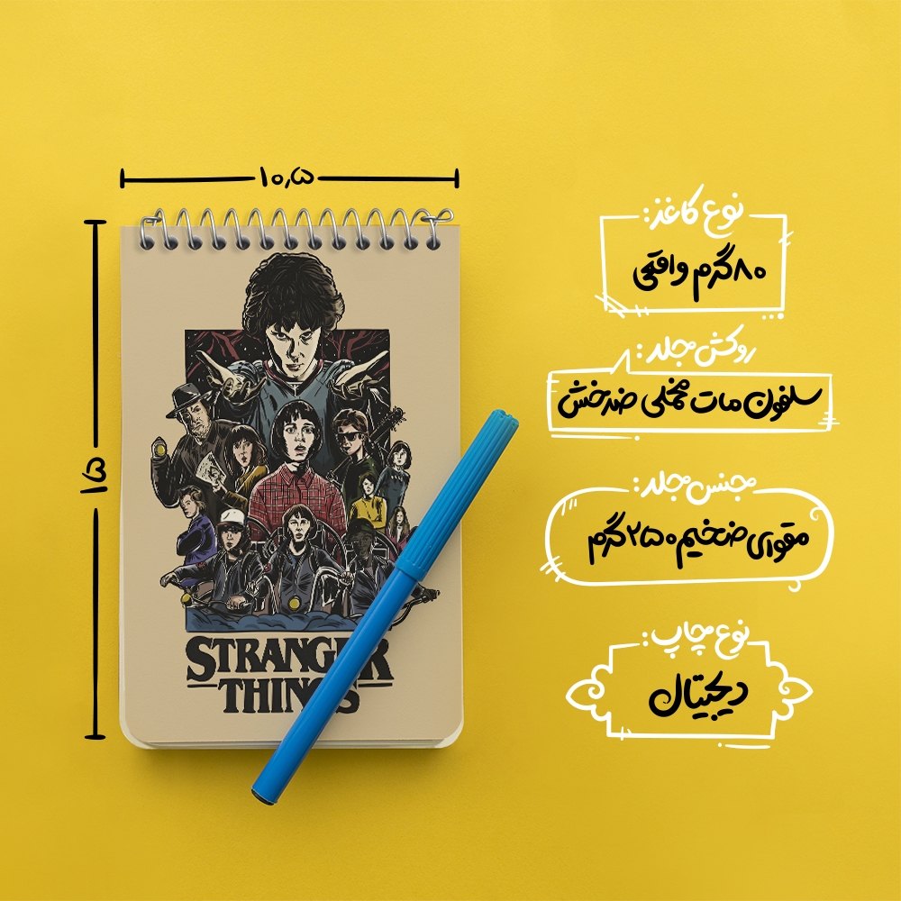 برند خندالو در زمینه تولید انواع دفاتر فانتزی و تحصیلی فعالیت میکند که به دلیل جذابیت ظاهری و طرح های متنوع طرفداران زیادی دارد. دفتر یادداشت خندالو طرح استرنجر تینگز (Stranger Things) محصولی مناسب برای همه عاشقان لوازم التحریر است و همچنین همه کسانی که بنا به موقعیت تحصیل یا شغلشان با دفتر و نوشت افزار زیاد سر و کار دارند. در تولید دفتر یادداشت خندالو طرح استرنجر تینگز (Stranger Things) از نوع صحافی فنر مارپیچ استفاده شده که در این نوع صحافی برگهها به راحتی چرخیده و یا بیرون آورده می شوند. دفتر های خندالو دارای جلد انعطاف پذیر از جنس مقوای گلاسه 250 گرم با روکش سلفون مات مخملی است که به شما امکان میدهد از دفتر خود بدون اینکه نگرانی از شکستن یا خراب شدن جلد را داشته باشید استفاده کنید و همچنین در این دفاتر از کاغذ 80 گرم با کیفیت استفاده شده که باعث میشود هنگام نوشتن به خوبی جوهر قلم بر روی صفحه نشسته و از خط خوردگیها جلوگیری کند. دفتر یادداشت خندالو با جنس و دوام مناسب، برگه های کاملاً سفید و خطوط طوسی دقیق را داراست که انسان را به نوشتن منظم و زیبا ترغیب میکند. طراحی کاملاً مناسب این دفاتر، به همراه کیفیت بالا، از آن یک محصول مورد علاقه و قابل اعتماد برای همه مقاطع تحصیلی میسازد. دفتر یادداشت خندالو طرح استرنجر تینگز (Stranger Things) انتخابی هوشمندانه و مناسب برای افرادی است که به دنبال دفتری با کیفیت و کاربرد عالی هستند. این دفتر، همراه خوبی برای شما در تمام مراحل تحصیل و کار خواهد بود و تجربهای لذتبخش از نوشتن و آموختن را به شما هدیه میدهد.