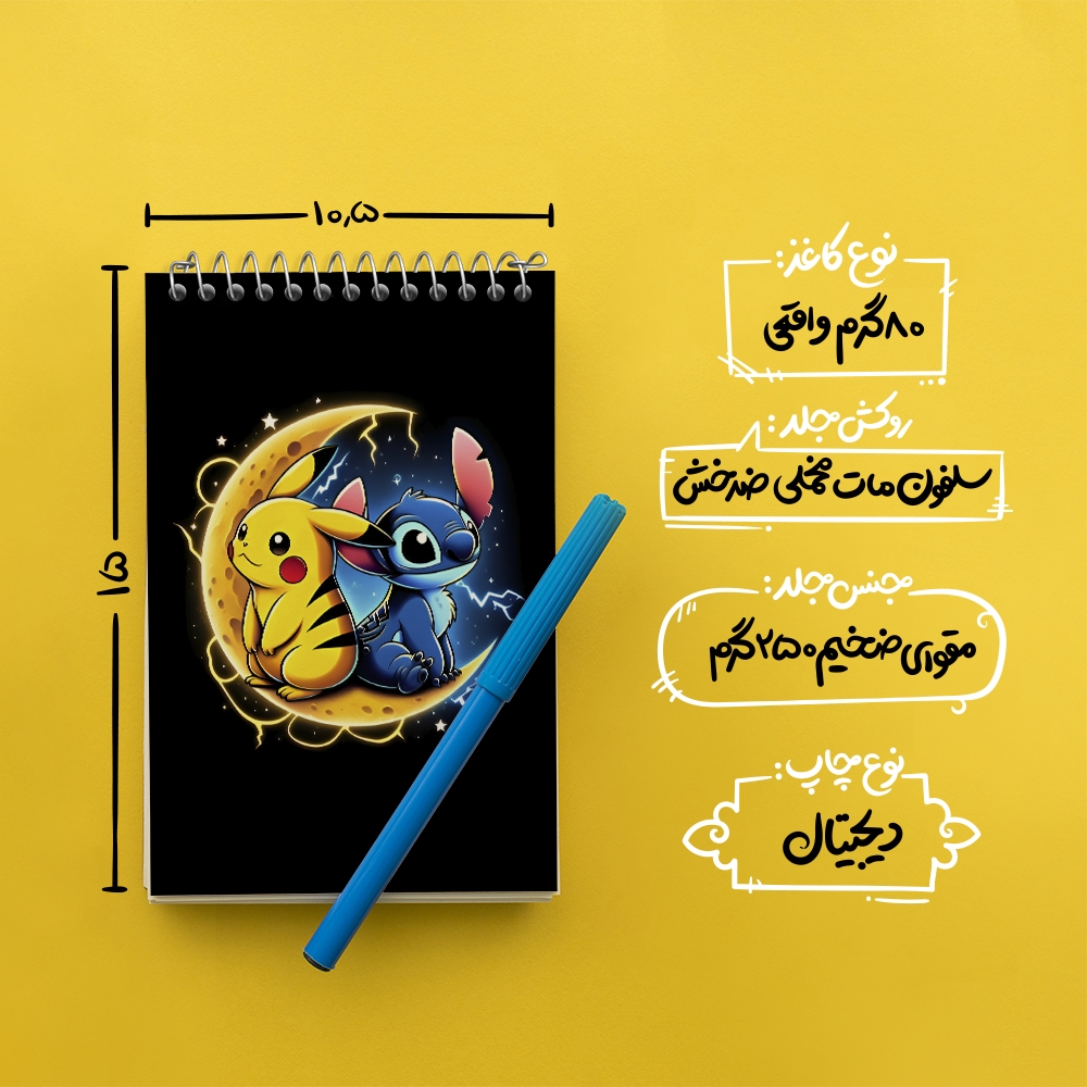 برند خندالو در زمینه تولید انواع دفاتر فانتزی و تحصیلی فعالیت میکند که به دلیل جذابیت ظاهری و طرح های متنوع طرفداران زیادی دارد. دفتر یادداشت خندالو طرح استیچ و پوکمون محصولی مناسب برای همه عاشقان لوازم التحریر است و همچنین همه کسانی که بنا به موقعیت تحصیل یا شغلشان با دفتر و نوشت افزار زیاد سر و کار دارند. در تولید دفتر یادداشت خندالو طرح استیچ و پوکمون از نوع صحافی فنر مارپیچ استفاده شده که در این نوع صحافی برگهها به راحتی چرخیده و یا بیرون آورده می شوند. دفتر های خندالو دارای جلد انعطاف پذیر از جنس مقوای گلاسه 250 گرم با روکش سلفون مات مخملی است که به شما امکان میدهد از دفتر خود بدون اینکه نگرانی از شکستن یا خراب شدن جلد را داشته باشید استفاده کنید و همچنین در این دفاتر از کاغذ 80 گرم با کیفیت استفاده شده که باعث میشود هنگام نوشتن به خوبی جوهر قلم بر روی صفحه نشسته و از خط خوردگیها جلوگیری کند. دفتر یادداشت خندالو با جنس و دوام مناسب، برگه های کاملاً سفید و خطوط طوسی دقیق را داراست که انسان را به نوشتن منظم و زیبا ترغیب میکند. طراحی کاملاً مناسب این دفاتر، به همراه کیفیت بالا، از آن یک محصول مورد علاقه و قابل اعتماد برای همه مقاطع تحصیلی میسازد. دفتر یادداشت خندالو طرح استیچ و پوکمون انتخابی هوشمندانه و مناسب برای افرادی است که به دنبال دفتری با کیفیت و کاربرد عالی هستند. این دفتر، همراه خوبی برای شما در تمام مراحل تحصیل و کار خواهد بود و تجربهای لذتبخش از نوشتن و آموختن را به شما هدیه میدهد.
