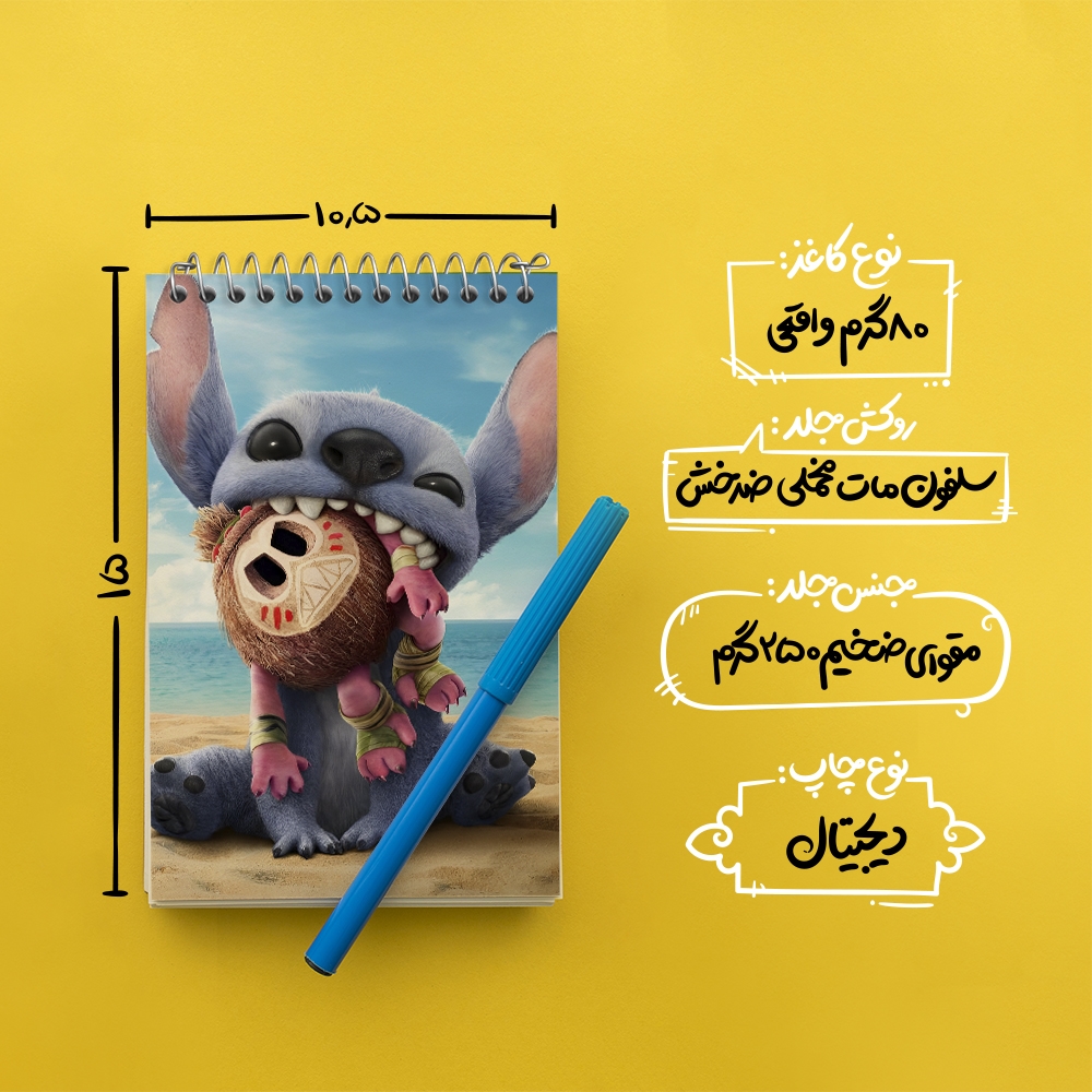 برند خندالو در زمینه تولید انواع دفاتر فانتزی و تحصیلی فعالیت میکند که به دلیل جذابیت ظاهری و طرح های متنوع طرفداران زیادی دارد. دفتر یادداشت خندالو طرح استیچ (Stitch) محصولی مناسب برای همه عاشقان لوازم التحریر است و همچنین همه کسانی که بنا به موقعیت تحصیل یا شغلشان با دفتر و نوشت افزار زیاد سر و کار دارند. در تولید دفتر یادداشت خندالو طرح استیچ (Stitch) از نوع صحافی فنر مارپیچ استفاده شده که در این نوع صحافی برگه‌ها به راحتی چرخیده و یا بیرون آورده می شوند.