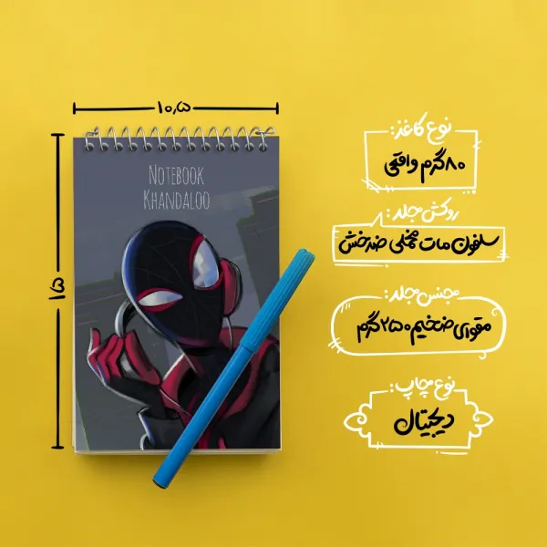 برند خندالو در زمینه تولید انواع دفاتر فانتزی و تحصیلی فعالیت میکند که به دلیل جذابیت ظاهری و طرح های متنوع طرفداران زیادی دارد. دفتر یادداشت خندالو طرح اسپایدرمن محصولی مناسب برای همه عاشقان لوازم التحریر است و همچنین همه کسانی که بنا به موقعیت تحصیل یا شغلشان با دفتر و نوشت افزار زیاد سر و کار دارند. در تولید دفتر یادداشت خندالو طرح اسپایدرمن از نوع صحافی فنر مارپیچ استفاده شده که در این نوع صحافی برگه‌ها به راحتی چرخیده و یا بیرون آورده می شوند.