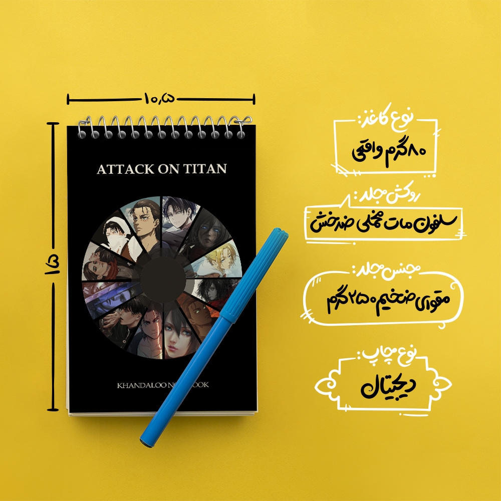 برند خندالو در زمینه تولید انواع دفاتر فانتزی و تحصیلی فعالیت میکند که به دلیل جذابیت ظاهری و طرح های متنوع طرفداران زیادی دارد. دفتر یادداشت خندالو طرح انیمه اتک آن تایتان (Attack on Titan) محصولی مناسب برای همه عاشقان لوازم التحریر است و همچنین همه کسانی که بنا به موقعیت تحصیل یا شغلشان با دفتر و نوشت افزار زیاد سر و کار دارند. در تولید دفتر یادداشت خندالو طرح انیمه اتک آن تایتان (Attack on Titan) از نوع صحافی فنر مارپیچ استفاده شده که در این نوع صحافی برگهها به راحتی چرخیده و یا بیرون آورده می شوند. دفتر های خندالو دارای جلد انعطاف پذیر از جنس مقوای گلاسه 250 گرم با روکش سلفون مات مخملی است که به شما امکان میدهد از دفتر خود بدون اینکه نگرانی از شکستن یا خراب شدن جلد را داشته باشید استفاده کنید و همچنین در این دفاتر از کاغذ 80 گرم با کیفیت استفاده شده که باعث میشود هنگام نوشتن به خوبی جوهر قلم بر روی صفحه نشسته و از خط خوردگیها جلوگیری کند. دفتر یادداشت خندالو با جنس و دوام مناسب، برگه های کاملاً سفید و خطوط طوسی دقیق را داراست که انسان را به نوشتن منظم و زیبا ترغیب میکند. طراحی کاملاً مناسب این دفاتر، به همراه کیفیت بالا، از آن یک محصول مورد علاقه و قابل اعتماد برای همه مقاطع تحصیلی میسازد. دفتر یادداشت خندالو طرح انیمه اتک آن تایتان (Attack on Titan) انتخابی هوشمندانه و مناسب برای افرادی است که به دنبال دفتری با کیفیت و کاربرد عالی هستند. این دفتر، همراه خوبی برای شما در تمام مراحل تحصیل و کار خواهد بود و تجربهای لذتبخش از نوشتن و آموختن را به شما هدیه میدهد.