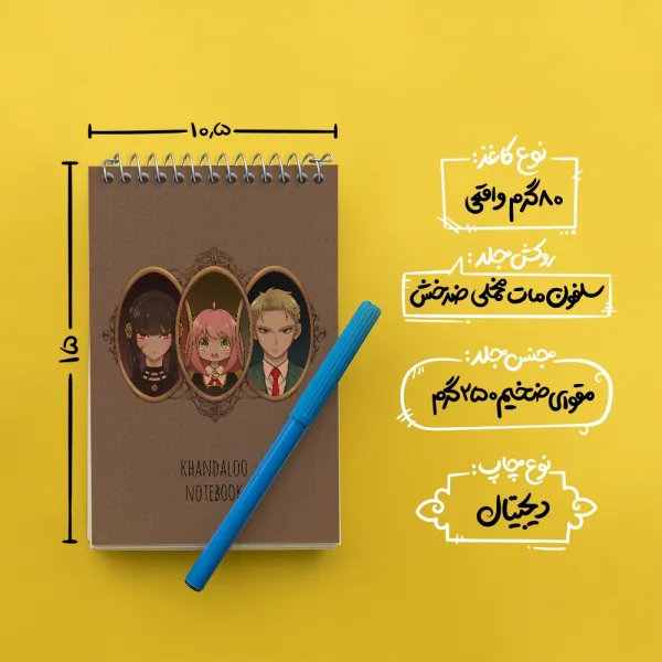 برند خندالو در زمینه تولید انواع دفاتر فانتزی و تحصیلی فعالیت میکند که به دلیل جذابیت ظاهری و طرح های متنوع طرفداران زیادی دارد. دفتر یادداشت خندالو طرح انیمه اسپای ایکس فمیلی (Spy × Family) محصولی مناسب برای همه عاشقان لوازم التحریر است و همچنین همه کسانی که بنا به موقعیت تحصیل یا شغلشان با دفتر و نوشت افزار زیاد سر و کار دارند. در تولید دفتر یادداشت خندالو طرح انیمه اسپای ایکس فمیلی (Spy × Family) از نوع صحافی فنر مارپیچ استفاده شده که در این نوع صحافی برگهها به راحتی چرخیده و یا بیرون آورده می شوند. دفتر های خندالو دارای جلد انعطاف پذیر از جنس مقوای گلاسه 250 گرم با روکش سلفون مات مخملی است که به شما امکان میدهد از دفتر خود بدون اینکه نگرانی از شکستن یا خراب شدن جلد را داشته باشید استفاده کنید و همچنین در این دفاتر از کاغذ 80 گرم با کیفیت استفاده شده که باعث میشود هنگام نوشتن به خوبی جوهر قلم بر روی صفحه نشسته و از خط خوردگیها جلوگیری کند. دفتر یادداشت خندالو با جنس و دوام مناسب، برگه های کاملاً سفید و خطوط طوسی دقیق را داراست که انسان را به نوشتن منظم و زیبا ترغیب میکند. طراحی کاملاً مناسب این دفاتر، به همراه کیفیت بالا، از آن یک محصول مورد علاقه و قابل اعتماد برای همه مقاطع تحصیلی میسازد. دفتر یادداشت خندالو طرح انیمه اسپای ایکس فمیلی (Spy × Family) انتخابی هوشمندانه و مناسب برای افرادی است که به دنبال دفتری با کیفیت و کاربرد عالی هستند. این دفتر، همراه خوبی برای شما در تمام مراحل تحصیل و کار خواهد بود و تجربهای لذتبخش از نوشتن و آموختن را به شما هدیه میدهد.