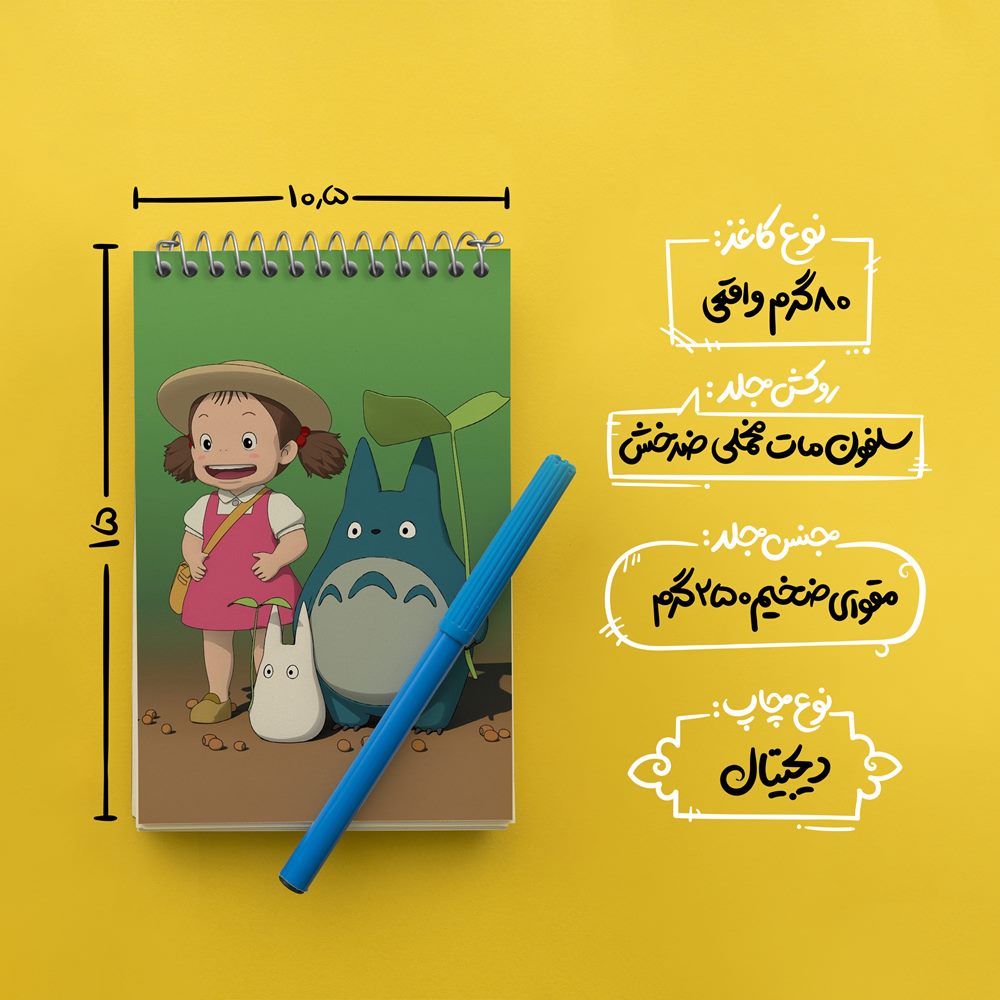 برند خندالو در زمینه تولید انواع دفاتر فانتزی و تحصیلی فعالیت میکند که به دلیل جذابیت ظاهری و طرح های متنوع طرفداران زیادی دارد. دفتر یادداشت خندالو طرح انیمه توتورو Totoro محصولی مناسب برای همه عاشقان لوازم التحریر است و همچنین همه کسانی که بنا به موقعیت تحصیل یا شغلشان با دفتر و نوشت افزار زیاد سر و کار دارند. در تولید دفتر یادداشت خندالو طرح انیمه توتورو Totoro از نوع صحافی فنر مارپیچ استفاده شده که در این نوع صحافی برگه‌ها به راحتی چرخیده و یا بیرون آورده می شوند.