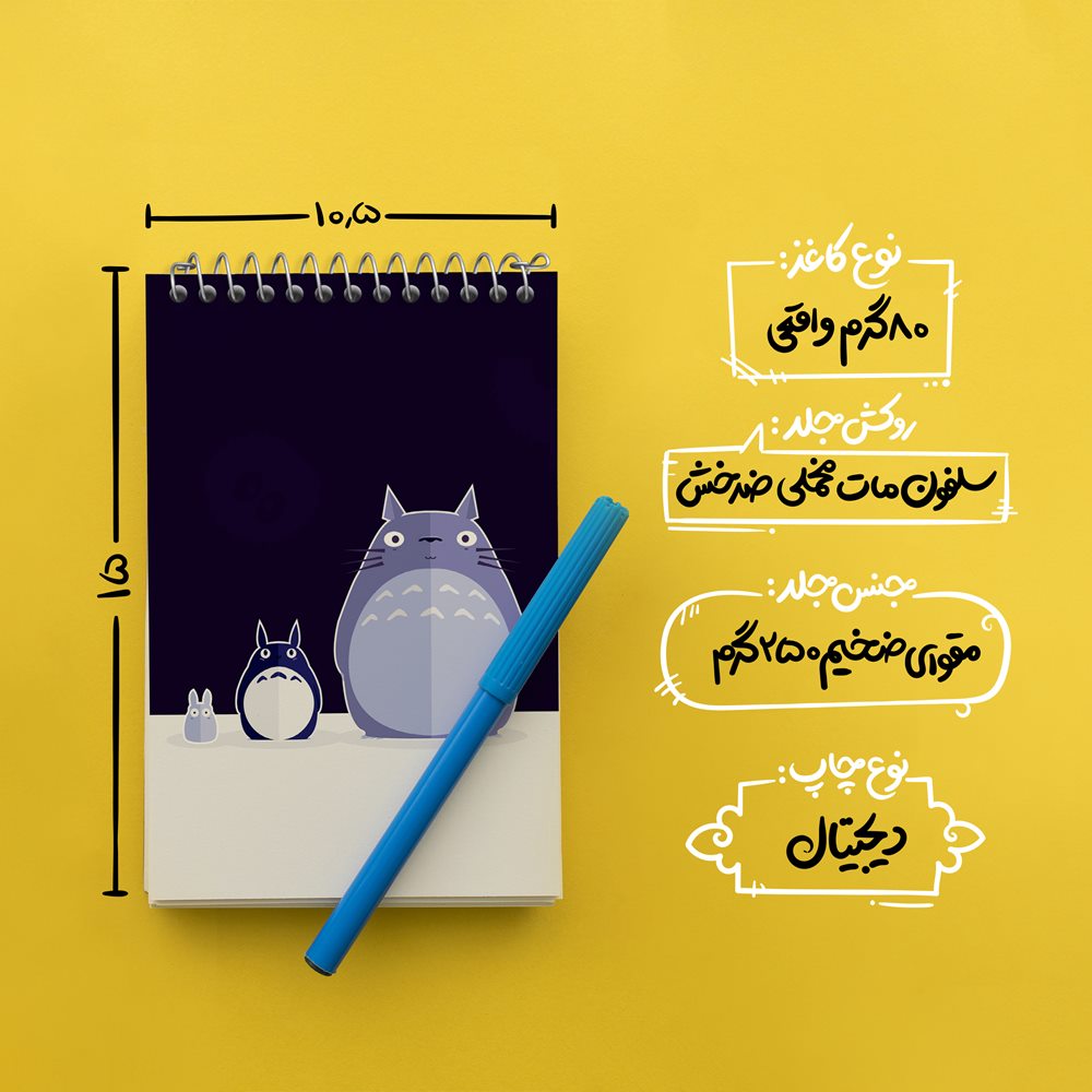 برند خندالو در زمینه تولید انواع دفاتر فانتزی و تحصیلی فعالیت میکند که به دلیل جذابیت ظاهری و طرح های متنوع طرفداران زیادی دارد. دفتر یادداشت خندالو طرح انیمه توتورو Totoro محصولی مناسب برای همه عاشقان لوازم التحریر است و همچنین همه کسانی که بنا به موقعیت تحصیل یا شغلشان با دفتر و نوشت افزار زیاد سر و کار دارند. در تولید دفتر یادداشت خندالو طرح انیمه توتورو Totoro از نوع صحافی فنر مارپیچ استفاده شده که در این نوع صحافی برگه‌ها به راحتی چرخیده و یا بیرون آورده می شوند.