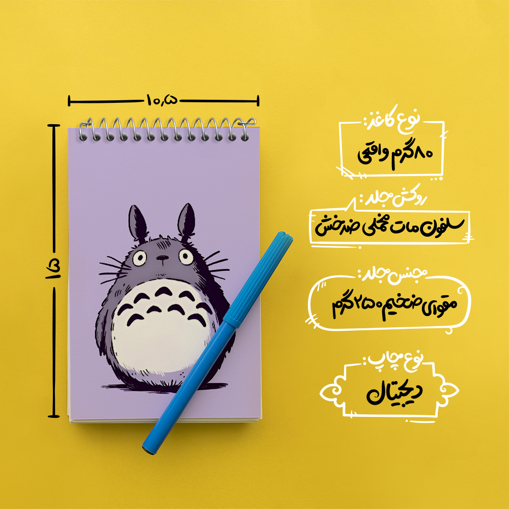 برند خندالو در زمینه تولید انواع دفاتر فانتزی و تحصیلی فعالیت میکند که به دلیل جذابیت ظاهری و طرح های متنوع طرفداران زیادی دارد. دفتر یادداشت خندالو طرح انیمه توتورو (Totoro) محصولی مناسب برای همه عاشقان لوازم التحریر است و همچنین همه کسانی که بنا به موقعیت تحصیل یا شغلشان با دفتر و نوشت افزار زیاد سر و کار دارند. در تولید دفتر یادداشت خندالو طرح انیمه توتورو (Totoro) از نوع صحافی فنر مارپیچ استفاده شده که در این نوع صحافی برگه‌ها به راحتی چرخیده و یا بیرون آورده می شوند.