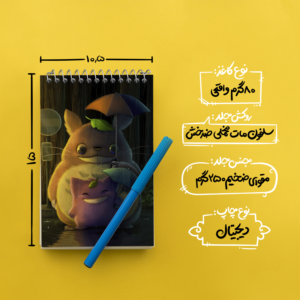 برند خندالو در زمینه تولید انواع دفاتر فانتزی و تحصیلی فعالیت میکند که به دلیل جذابیت ظاهری و طرح های متنوع طرفداران زیادی دارد. دفتر یادداشت خندالو طرح انیمه توتورو (Totoro) محصولی مناسب برای همه عاشقان لوازم التحریر است و همچنین همه کسانی که بنا به موقعیت تحصیل یا شغلشان با دفتر و نوشت افزار زیاد سر و کار دارند. در تولید دفتر یادداشت خندالو طرح انیمه توتورو (Totoro) از نوع صحافی فنر مارپیچ استفاده شده که در این نوع صحافی برگه‌ها به راحتی چرخیده و یا بیرون آورده می شوند.
