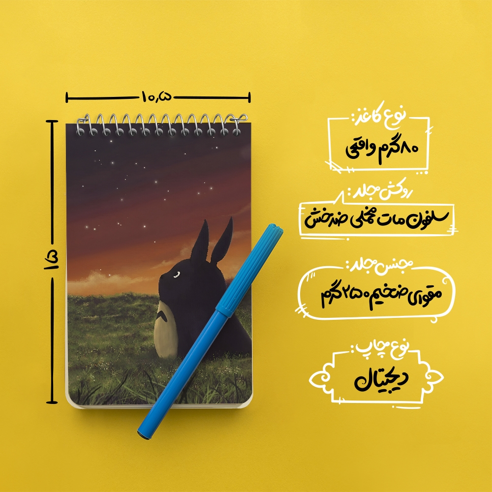 برند خندالو در زمینه تولید انواع دفاتر فانتزی و تحصیلی فعالیت میکند که به دلیل جذابیت ظاهری و طرح های متنوع طرفداران زیادی دارد. دفتر یادداشت خندالو طرح انیمه توتورو (Totoro) محصولی مناسب برای همه عاشقان لوازم التحریر است و همچنین همه کسانی که بنا به موقعیت تحصیل یا شغلشان با دفتر و نوشت افزار زیاد سر و کار دارند. در تولید دفتر یادداشت خندالو طرح انیمه توتورو (Totoro) از نوع صحافی فنر مارپیچ استفاده شده که در این نوع صحافی برگه‌ها به راحتی چرخیده و یا بیرون آورده می شوند.