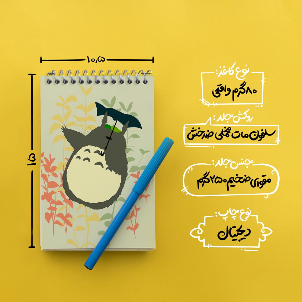 برند خندالو در زمینه تولید انواع دفاتر فانتزی و تحصیلی فعالیت میکند که به دلیل جذابیت ظاهری و طرح های متنوع طرفداران زیادی دارد. دفتر یادداشت خندالو طرح انیمه توتورو Totoro محصولی مناسب برای همه عاشقان لوازم التحریر است و همچنین همه کسانی که بنا به موقعیت تحصیل یا شغلشان با دفتر و نوشت افزار زیاد سر و کار دارند. در تولید دفتر یادداشت خندالو طرح انیمه توتورو Totoro از نوع صحافی فنر مارپیچ استفاده شده که در این نوع صحافی برگه‌ها به راحتی چرخیده و یا بیرون آورده می شوند.