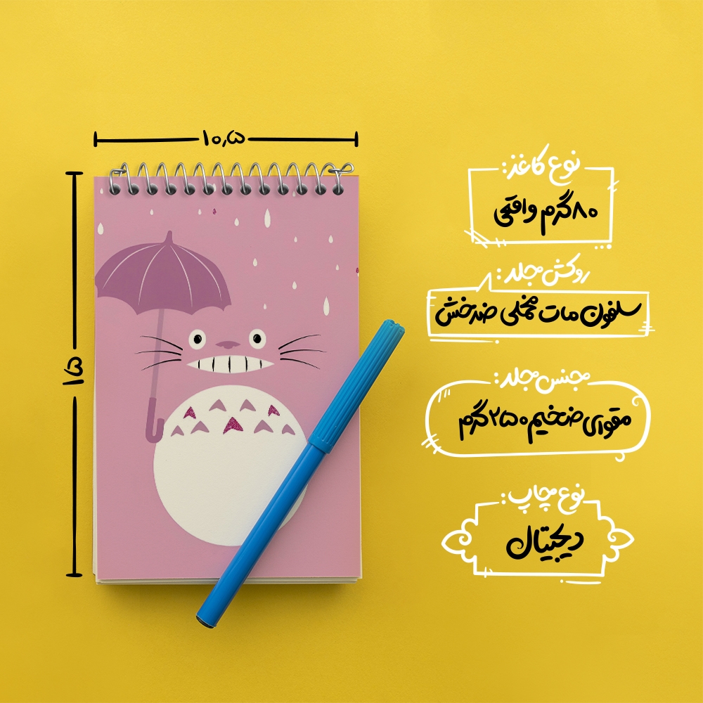 برند خندالو در زمینه تولید انواع دفاتر فانتزی و تحصیلی فعالیت میکند که به دلیل جذابیت ظاهری و طرح های متنوع طرفداران زیادی دارد. دفتر یادداشت خندالو طرح انیمه توتورو (Totoro) محصولی مناسب برای همه عاشقان لوازم التحریر است و همچنین همه کسانی که بنا به موقعیت تحصیل یا شغلشان با دفتر و نوشت افزار زیاد سر و کار دارند. در تولید دفتر یادداشت خندالو طرح انیمه توتورو (Totoro) از نوع صحافی فنر مارپیچ استفاده شده که در این نوع صحافی برگه‌ها به راحتی چرخیده و یا بیرون آورده می شوند.