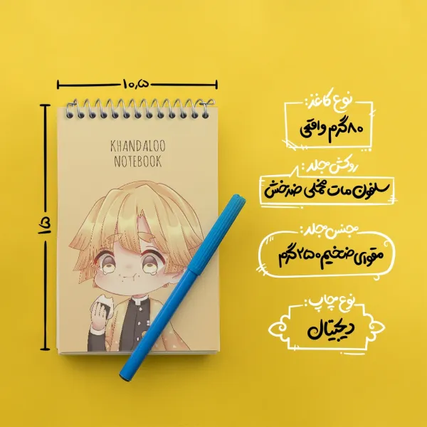 برند خندالو در زمینه تولید انواع دفاتر فانتزی و تحصیلی فعالیت میکند که به دلیل جذابیت ظاهری و طرح های متنوع طرفداران زیادی دارد. دفتر یادداشت خندالو طرح انیمه شیطان کش (Demon Slayer) محصولی مناسب برای همه عاشقان لوازم التحریر است و همچنین همه کسانی که بنا به موقعیت تحصیل یا شغلشان با دفتر و نوشت افزار زیاد سر و کار دارند. در تولید دفتر یادداشت خندالو طرح انیمه شیطان کش (Demon Slayer) از نوع صحافی فنر مارپیچ استفاده شده که در این نوع صحافی برگه‌ها به راحتی چرخیده و یا بیرون آورده می شوند.