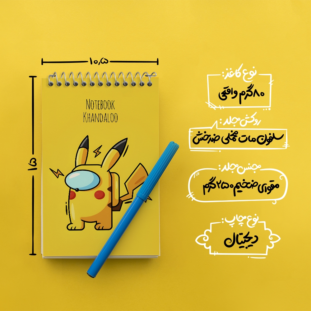 برند خندالو در زمینه تولید انواع دفاتر فانتزی و تحصیلی فعالیت میکند که به دلیل جذابیت ظاهری و طرح های متنوع طرفداران زیادی دارد. دفتر یادداشت خندالو طرح انیمه پوکمون (Pokemon) محصولی مناسب برای همه عاشقان لوازم التحریر است و همچنین همه کسانی که بنا به موقعیت تحصیل یا شغلشان با دفتر و نوشت افزار زیاد سر و کار دارند. در تولید دفتر یادداشت خندالو طرح انیمه پوکمون (Pokemon) از نوع صحافی فنر مارپیچ استفاده شده که در این نوع صحافی برگه‌ها به راحتی چرخیده و یا بیرون آورده می شوند.