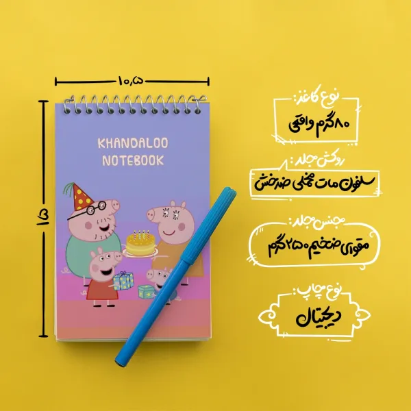 برند خندالو در زمینه تولید انواع دفاتر فانتزی و تحصیلی فعالیت میکند که به دلیل جذابیت ظاهری و طرح های متنوع طرفداران زیادی دارد. دفتر یادداشت خندالو طرح انیمیشن پپا پیگ (Peppa Pig) محصولی مناسب برای همه عاشقان لوازم التحریر است و همچنین همه کسانی که بنا به موقعیت تحصیل یا شغلشان با دفتر و نوشت افزار زیاد سر و کار دارند. در تولید دفتر یادداشت خندالو طرح انیمیشن پپا پیگ (Peppa Pig) از نوع صحافی فنر مارپیچ استفاده شده که در این نوع صحافی برگهها به راحتی چرخیده و یا بیرون آورده می شوند. دفتر های خندالو دارای جلد انعطاف پذیر از جنس مقوای گلاسه 250 گرم با روکش سلفون مات مخملی است که به شما امکان میدهد از دفتر خود بدون اینکه نگرانی از شکستن یا خراب شدن جلد را داشته باشید استفاده کنید و همچنین در این دفاتر از کاغذ 80 گرم با کیفیت استفاده شده که باعث میشود هنگام نوشتن به خوبی جوهر قلم بر روی صفحه نشسته و از خط خوردگیها جلوگیری کند. دفتر یادداشت خندالو با جنس و دوام مناسب، برگه های کاملاً سفید و خطوط طوسی دقیق را داراست که انسان را به نوشتن منظم و زیبا ترغیب میکند. طراحی کاملاً مناسب این دفاتر، به همراه کیفیت بالا، از آن یک محصول مورد علاقه و قابل اعتماد برای همه مقاطع تحصیلی میسازد. دفتر یادداشت خندالو طرح انیمیشن پپا پیگ (Peppa Pig) انتخابی هوشمندانه و مناسب برای افرادی است که به دنبال دفتری با کیفیت و کاربرد عالی هستند. این دفتر، همراه خوبی برای شما در تمام مراحل تحصیل و کار خواهد بود و تجربهای لذتبخش از نوشتن و آموختن را به شما هدیه میدهد.