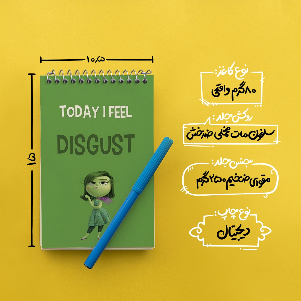 برند خندالو در زمینه تولید انواع دفاتر فانتزی و تحصیلی فعالیت میکند که به دلیل جذابیت ظاهری و طرح های متنوع طرفداران زیادی دارد. دفتر یادداشت خندالو طرح اینساید اوت (Disgust) محصولی مناسب برای همه عاشقان لوازم التحریر است و همچنین همه کسانی که بنا به موقعیت تحصیل یا شغلشان با دفتر و نوشت افزار زیاد سر و کار دارند. در تولید دفتر یادداشت خندالو طرح اینساید اوت (Disgust) از نوع صحافی فنر مارپیچ استفاده شده که در این نوع صحافی برگهها به راحتی چرخیده و یا بیرون آورده می شوند. دفتر های خندالو دارای جلد انعطاف پذیر از جنس مقوای گلاسه 250 گرم با روکش سلفون مات مخملی است که به شما امکان میدهد از دفتر خود بدون اینکه نگرانی از شکستن یا خراب شدن جلد را داشته باشید استفاده کنید و همچنین در این دفاتر از کاغذ 80 گرم با کیفیت استفاده شده که باعث میشود هنگام نوشتن به خوبی جوهر قلم بر روی صفحه نشسته و از خط خوردگیها جلوگیری کند. دفتر یادداشت خندالو با جنس و دوام مناسب، برگه های کاملاً سفید و خطوط طوسی دقیق را داراست که انسان را به نوشتن منظم و زیبا ترغیب میکند. طراحی کاملاً مناسب این دفاتر، به همراه کیفیت بالا، از آن یک محصول مورد علاقه و قابل اعتماد برای همه مقاطع تحصیلی میسازد. دفتر یادداشت خندالو طرح اینساید اوت (Disgust) انتخابی هوشمندانه و مناسب برای افرادی است که به دنبال دفتری با کیفیت و کاربرد عالی هستند. این دفتر، همراه خوبی برای شما در تمام مراحل تحصیل و کار خواهد بود و تجربهای لذتبخش از نوشتن و آموختن را به شما هدیه میدهد.