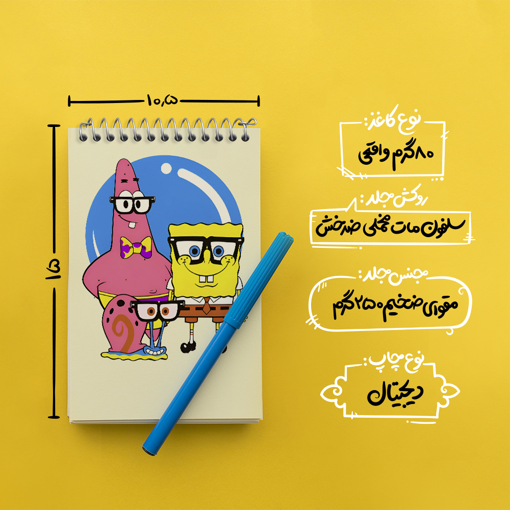 برند خندالو در زمینه تولید انواع دفاتر فانتزی و تحصیلی فعالیت میکند که به دلیل جذابیت ظاهری و طرح های متنوع طرفداران زیادی دارد. دفتر یادداشت خندالو طرح باب اسفنجی و پاتریک محصولی مناسب برای همه عاشقان لوازم التحریر است و همچنین همه کسانی که بنا به موقعیت تحصیل یا شغلشان با دفتر و نوشت افزار زیاد سر و کار دارند. در تولید دفتر یادداشت خندالو طرح باب اسفنجی و پاتریک از نوع صحافی فنر مارپیچ استفاده شده که در این نوع صحافی برگه‌ها به راحتی چرخیده و یا بیرون آورده می شوند.