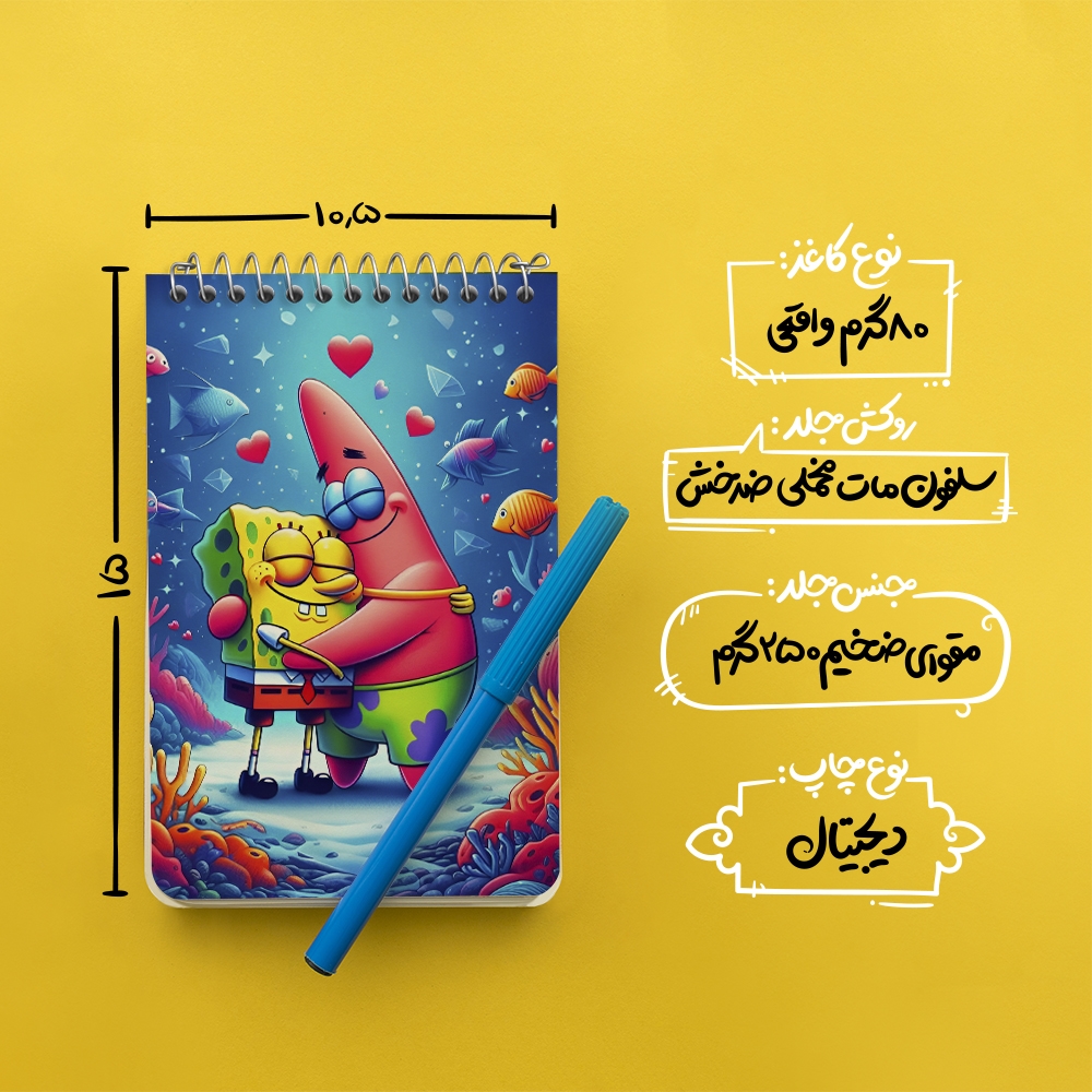 برند خندالو در زمینه تولید انواع دفاتر فانتزی و تحصیلی فعالیت میکند که به دلیل جذابیت ظاهری و طرح های متنوع طرفداران زیادی دارد. دفتر یادداشت خندالو طرح باب اسفنجی و پاتریک محصولی مناسب برای همه عاشقان لوازم التحریر است و همچنین همه کسانی که بنا به موقعیت تحصیل یا شغلشان با دفتر و نوشت افزار زیاد سر و کار دارند. در تولید دفتر یادداشت خندالو طرح باب اسفنجی و پاتریک از نوع صحافی فنر مارپیچ استفاده شده که در این نوع صحافی برگه‌ها به راحتی چرخیده و یا بیرون آورده می شوند.