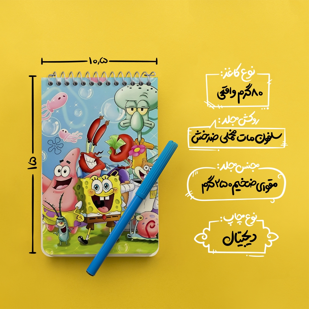برند خندالو در زمینه تولید انواع دفاتر فانتزی و تحصیلی فعالیت میکند که به دلیل جذابیت ظاهری و طرح های متنوع طرفداران زیادی دارد. دفتر یادداشت خندالو طرح باب اسفنجی و پاتریک محصولی مناسب برای همه عاشقان لوازم التحریر است و همچنین همه کسانی که بنا به موقعیت تحصیل یا شغلشان با دفتر و نوشت افزار زیاد سر و کار دارند. در تولید دفتر یادداشت خندالو طرح باب اسفنجی و پاتریک از نوع صحافی فنر مارپیچ استفاده شده که در این نوع صحافی برگه‌ها به راحتی چرخیده و یا بیرون آورده می شوند.