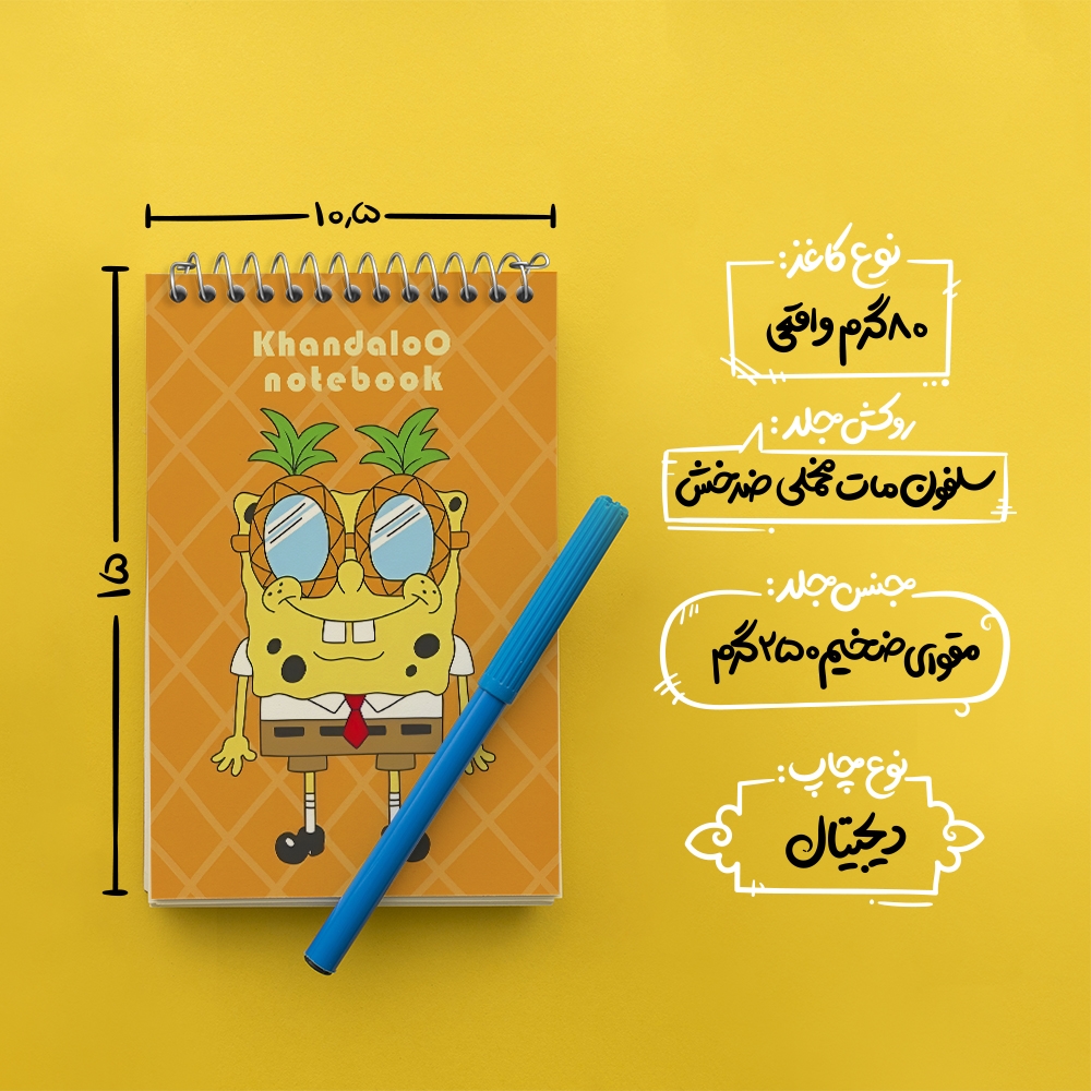 برند خندالو در زمینه تولید انواع دفاتر فانتزی و تحصیلی فعالیت میکند که به دلیل جذابیت ظاهری و طرح های متنوع طرفداران زیادی دارد. دفتر یادداشت خندالو طرح باب اسفنجی محصولی مناسب برای همه عاشقان لوازم التحریر است و همچنین همه کسانی که بنا به موقعیت تحصیل یا شغلشان با دفتر و نوشت افزار زیاد سر و کار دارند. در تولید دفتر یادداشت خندالو طرح باب اسفنجی از نوع صحافی فنر مارپیچ استفاده شده که در این نوع صحافی برگه‌ها به راحتی چرخیده و یا بیرون آورده می شوند.