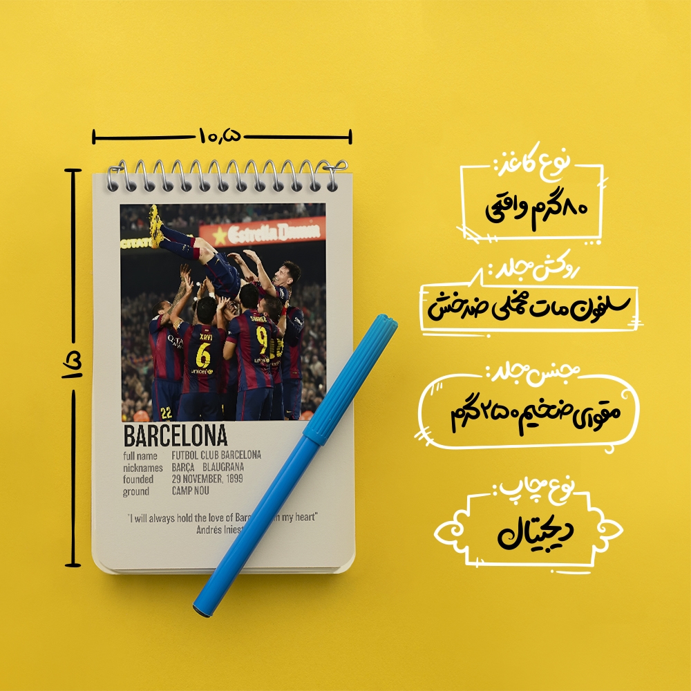 برند خندالو در زمینه تولید انواع دفاتر فانتزی و تحصیلی فعالیت میکند که به دلیل جذابیت ظاهری و طرح های متنوع طرفداران زیادی دارد. دفتر یادداشت خندالو طرح بارسلونا (Barcelona) محصولی مناسب برای همه عاشقان لوازم التحریر است و همچنین همه کسانی که بنا به موقعیت تحصیل یا شغلشان با دفتر و نوشت افزار زیاد سر و کار دارند. در تولید دفتر یادداشت خندالو طرح بارسلونا (Barcelona) از نوع صحافی فنر مارپیچ استفاده شده که در این نوع صحافی برگهها به راحتی چرخیده و یا بیرون آورده می شوند. دفتر های خندالو دارای جلد انعطاف پذیر از جنس مقوای گلاسه 250 گرم با روکش سلفون مات مخملی است که به شما امکان میدهد از دفتر خود بدون اینکه نگرانی از شکستن یا خراب شدن جلد را داشته باشید استفاده کنید و همچنین در این دفاتر از کاغذ 80 گرم با کیفیت استفاده شده که باعث میشود هنگام نوشتن به خوبی جوهر قلم بر روی صفحه نشسته و از خط خوردگیها جلوگیری کند. دفتر یادداشت خندالو با جنس و دوام مناسب، برگه های کاملاً سفید و خطوط طوسی دقیق را داراست که انسان را به نوشتن منظم و زیبا ترغیب میکند. طراحی کاملاً مناسب این دفاتر، به همراه کیفیت بالا، از آن یک محصول مورد علاقه و قابل اعتماد برای همه مقاطع تحصیلی میسازد. دفتر یادداشت خندالو طرح بارسلونا (Barcelona) انتخابی هوشمندانه و مناسب برای افرادی است که به دنبال دفتری با کیفیت و کاربرد عالی هستند. این دفتر، همراه خوبی برای شما در تمام مراحل تحصیل و کار خواهد بود و تجربهای لذتبخش از نوشتن و آموختن را به شما هدیه میدهد.