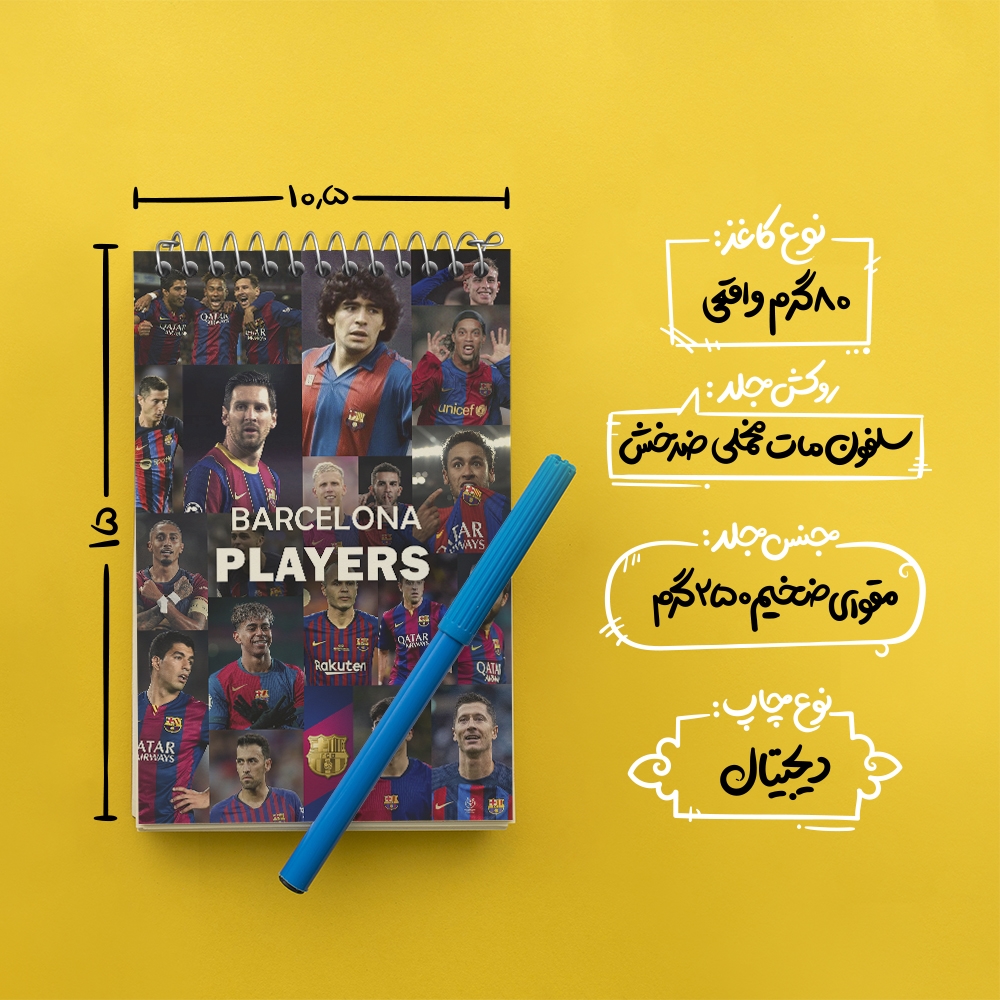برند خندالو در زمینه تولید انواع دفاتر فانتزی و تحصیلی فعالیت میکند که به دلیل جذابیت ظاهری و طرح های متنوع طرفداران زیادی دارد. دفتر یادداشت خندالو طرح بازیکن های بارسلونا (Barcelona) محصولی مناسب برای همه عاشقان لوازم التحریر است و همچنین همه کسانی که بنا به موقعیت تحصیل یا شغلشان با دفتر و نوشت افزار زیاد سر و کار دارند. در تولید دفتر یادداشت خندالو طرح بازیکن های بارسلونا (Barcelona) از نوع صحافی فنر مارپیچ استفاده شده که در این نوع صحافی برگهها به راحتی چرخیده و یا بیرون آورده می شوند. دفتر های خندالو دارای جلد انعطاف پذیر از جنس مقوای گلاسه 250 گرم با روکش سلفون مات مخملی است که به شما امکان میدهد از دفتر خود بدون اینکه نگرانی از شکستن یا خراب شدن جلد را داشته باشید استفاده کنید و همچنین در این دفاتر از کاغذ 80 گرم با کیفیت استفاده شده که باعث میشود هنگام نوشتن به خوبی جوهر قلم بر روی صفحه نشسته و از خط خوردگیها جلوگیری کند. دفتر یادداشت خندالو با جنس و دوام مناسب، برگه های کاملاً سفید و خطوط طوسی دقیق را داراست که انسان را به نوشتن منظم و زیبا ترغیب میکند. طراحی کاملاً مناسب این دفاتر، به همراه کیفیت بالا، از آن یک محصول مورد علاقه و قابل اعتماد برای همه مقاطع تحصیلی میسازد. دفتر یادداشت خندالو طرح بازیکن های بارسلونا (Barcelona) انتخابی هوشمندانه و مناسب برای افرادی است که به دنبال دفتری با کیفیت و کاربرد عالی هستند. این دفتر، همراه خوبی برای شما در تمام مراحل تحصیل و کار خواهد بود و تجربهای لذتبخش از نوشتن و آموختن را به شما هدیه میدهد.