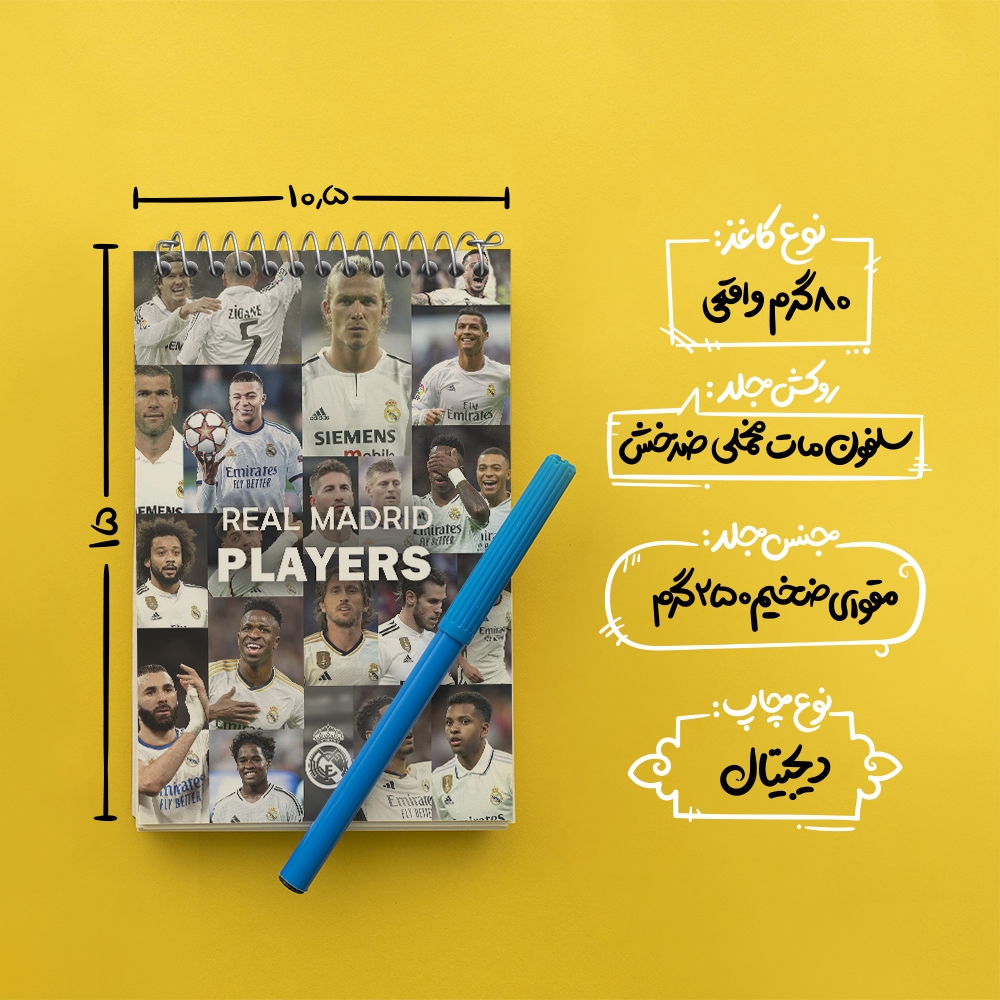 برند خندالو در زمینه تولید انواع دفاتر فانتزی و تحصیلی فعالیت میکند که به دلیل جذابیت ظاهری و طرح های متنوع طرفداران زیادی دارد. دفتر یادداشت خندالو طرح بازیکن های رئال مادرید (Real Madrid) محصولی مناسب برای همه عاشقان لوازم التحریر است و همچنین همه کسانی که بنا به موقعیت تحصیل یا شغلشان با دفتر و نوشت افزار زیاد سر و کار دارند. در تولید دفتر یادداشت خندالو طرح بازیکن های رئال مادرید (Real Madrid) از نوع صحافی فنر مارپیچ استفاده شده که در این نوع صحافی برگهها به راحتی چرخیده و یا بیرون آورده می شوند. دفتر های خندالو دارای جلد انعطاف پذیر از جنس مقوای گلاسه 250 گرم با روکش سلفون مات مخملی است که به شما امکان میدهد از دفتر خود بدون اینکه نگرانی از شکستن یا خراب شدن جلد را داشته باشید استفاده کنید و همچنین در این دفاتر از کاغذ 80 گرم با کیفیت استفاده شده که باعث میشود هنگام نوشتن به خوبی جوهر قلم بر روی صفحه نشسته و از خط خوردگیها جلوگیری کند. دفتر یادداشت خندالو با جنس و دوام مناسب، برگه های کاملاً سفید و خطوط طوسی دقیق را داراست که انسان را به نوشتن منظم و زیبا ترغیب میکند. طراحی کاملاً مناسب این دفاتر، به همراه کیفیت بالا، از آن یک محصول مورد علاقه و قابل اعتماد برای همه مقاطع تحصیلی میسازد. دفتر یادداشت خندالو طرح بازیکن های رئال مادرید (Real Madrid) انتخابی هوشمندانه و مناسب برای افرادی است که به دنبال دفتری با کیفیت و کاربرد عالی هستند. این دفتر، همراه خوبی برای شما در تمام مراحل تحصیل و کار خواهد بود و تجربهای لذتبخش از نوشتن و آموختن را به شما هدیه میدهد.