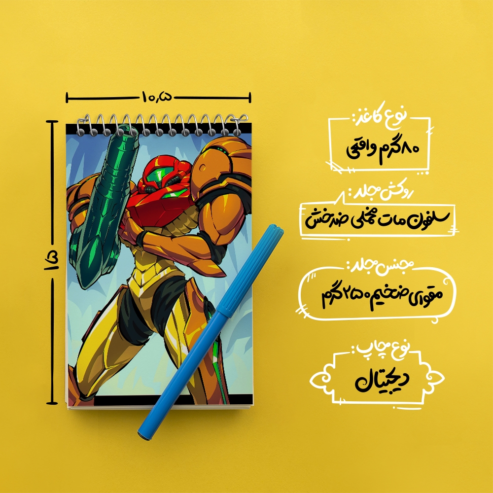 برند خندالو در زمینه تولید انواع دفاتر فانتزی و تحصیلی فعالیت میکند که به دلیل جذابیت ظاهری و طرح های متنوع طرفداران زیادی دارد. دفتر یادداشت خندالو طرح بازی متروید (Metroid) محصولی مناسب برای همه عاشقان لوازم التحریر است و همچنین همه کسانی که بنا به موقعیت تحصیل یا شغلشان با دفتر و نوشت افزار زیاد سر و کار دارند. در تولید دفتر یادداشت خندالو طرح بازی متروید (Metroid) از نوع صحافی فنر مارپیچ استفاده شده که در این نوع صحافی برگه‌ها به راحتی چرخیده و یا بیرون آورده می شوند.