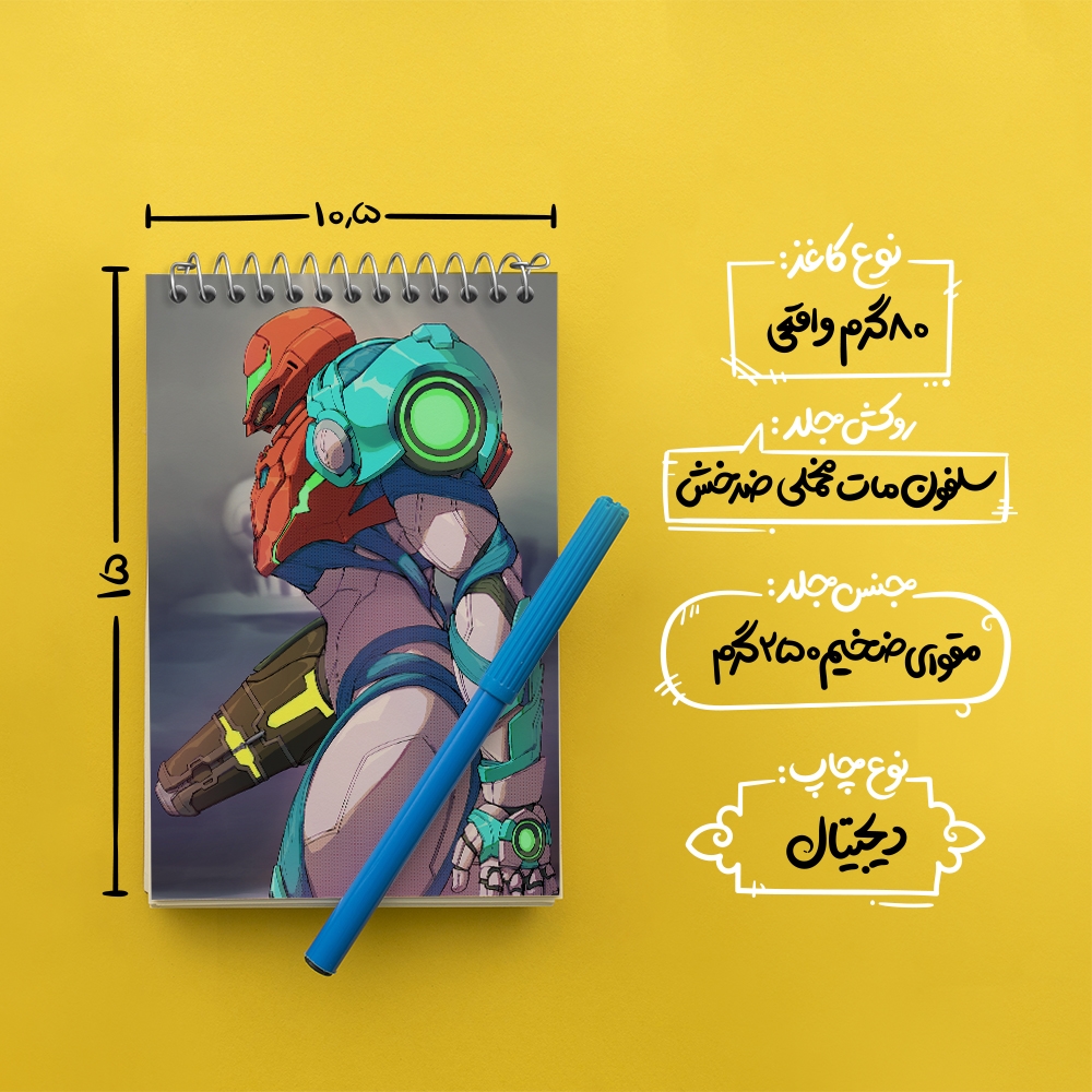 برند خندالو در زمینه تولید انواع دفاتر فانتزی و تحصیلی فعالیت میکند که به دلیل جذابیت ظاهری و طرح های متنوع طرفداران زیادی دارد. دفتر یادداشت خندالو طرح بازی متروید (Metroid) محصولی مناسب برای همه عاشقان لوازم التحریر است و همچنین همه کسانی که بنا به موقعیت تحصیل یا شغلشان با دفتر و نوشت افزار زیاد سر و کار دارند. در تولید دفتر یادداشت خندالو طرح بازی متروید (Metroid) از نوع صحافی فنر مارپیچ استفاده شده که در این نوع صحافی برگه‌ها به راحتی چرخیده و یا بیرون آورده می شوند.