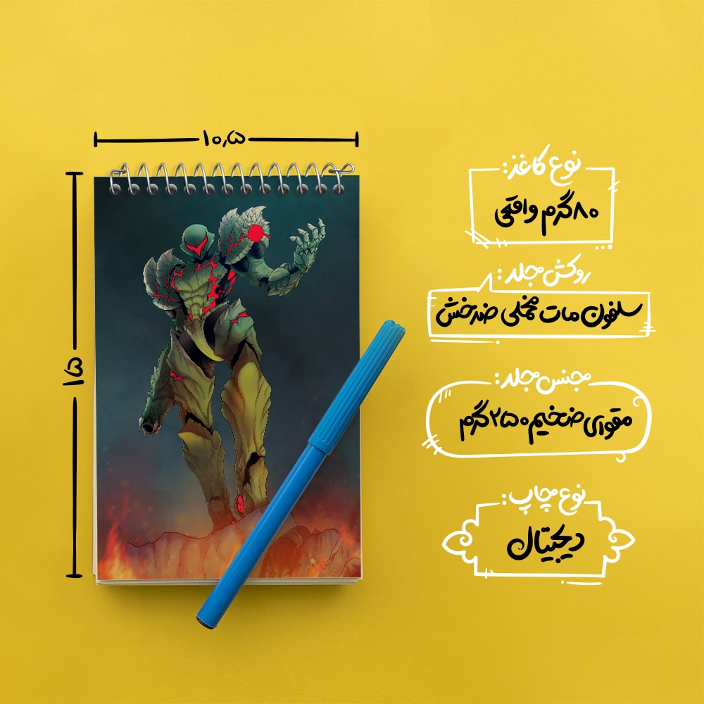 برند خندالو در زمینه تولید انواع دفاتر فانتزی و تحصیلی فعالیت میکند که به دلیل جذابیت ظاهری و طرح های متنوع طرفداران زیادی دارد. دفتر یادداشت خندالو طرح بازی متروید (Metroid) محصولی مناسب برای همه عاشقان لوازم التحریر است و همچنین همه کسانی که بنا به موقعیت تحصیل یا شغلشان با دفتر و نوشت افزار زیاد سر و کار دارند. در تولید دفتر یادداشت خندالو طرح بازی متروید (Metroid) از نوع صحافی فنر مارپیچ استفاده شده که در این نوع صحافی برگه‌ها به راحتی چرخیده و یا بیرون آورده می شوند.