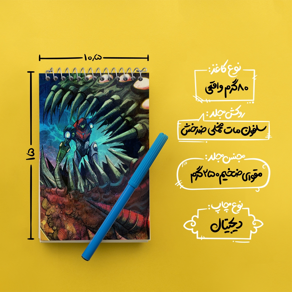 برند خندالو در زمینه تولید انواع دفاتر فانتزی و تحصیلی فعالیت میکند که به دلیل جذابیت ظاهری و طرح های متنوع طرفداران زیادی دارد. دفتر یادداشت خندالو طرح بازی متروید (Metroid) محصولی مناسب برای همه عاشقان لوازم التحریر است و همچنین همه کسانی که بنا به موقعیت تحصیل یا شغلشان با دفتر و نوشت افزار زیاد سر و کار دارند. در تولید دفتر یادداشت خندالو طرح بازی متروید (Metroid) از نوع صحافی فنر مارپیچ استفاده شده که در این نوع صحافی برگهها به راحتی چرخیده و یا بیرون آورده می شوند. دفتر های خندالو دارای جلد انعطاف پذیر از جنس مقوای گلاسه 250 گرم با روکش سلفون مات مخملی است که به شما امکان میدهد از دفتر خود بدون اینکه نگرانی از شکستن یا خراب شدن جلد را داشته باشید استفاده کنید و همچنین در این دفاتر از کاغذ 80 گرم با کیفیت استفاده شده که باعث میشود هنگام نوشتن به خوبی جوهر قلم بر روی صفحه نشسته و از خط خوردگیها جلوگیری کند. دفتر یادداشت خندالو با جنس و دوام مناسب، برگه های کاملاً سفید و خطوط طوسی دقیق را داراست که انسان را به نوشتن منظم و زیبا ترغیب میکند. طراحی کاملاً مناسب این دفاتر، به همراه کیفیت بالا، از آن یک محصول مورد علاقه و قابل اعتماد برای همه مقاطع تحصیلی میسازد. دفتر یادداشت خندالو طرح بازی متروید (Metroid) انتخابی هوشمندانه و مناسب برای افرادی است که به دنبال دفتری با کیفیت و کاربرد عالی هستند. این دفتر، همراه خوبی برای شما در تمام مراحل تحصیل و کار خواهد بود و تجربهای لذتبخش از نوشتن و آموختن را به شما هدیه میدهد.