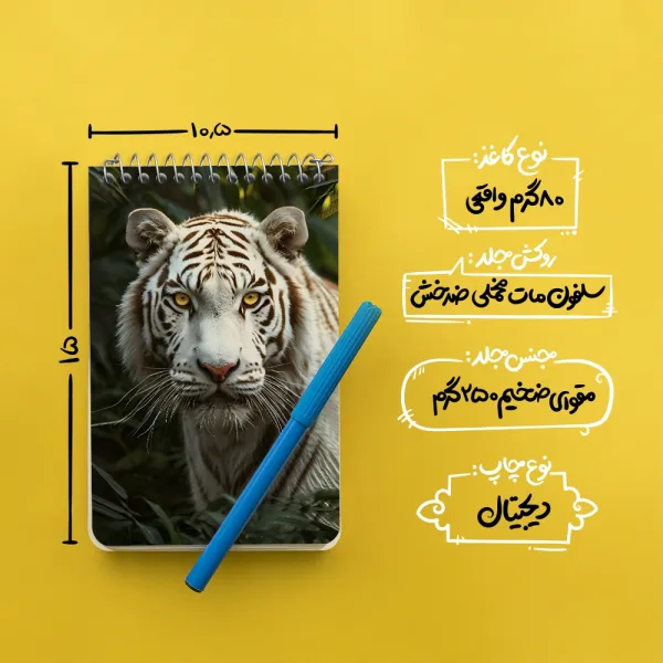 برند خندالو در زمینه تولید انواع دفاتر فانتزی و تحصیلی فعالیت میکند که به دلیل جذابیت ظاهری و طرح های متنوع طرفداران زیادی دارد. دفتر یادداشت خندالو طرح ببر سفید محصولی مناسب برای همه عاشقان لوازم التحریر است و همچنین همه کسانی که بنا به موقعیت تحصیل یا شغلشان با دفتر و نوشت افزار زیاد سر و کار دارند. در تولید دفتر یادداشت خندالو طرح ببر سفید از نوع صحافی فنر مارپیچ استفاده شده که در این نوع صحافی برگه‌ها به راحتی چرخیده و یا بیرون آورده می شوند.