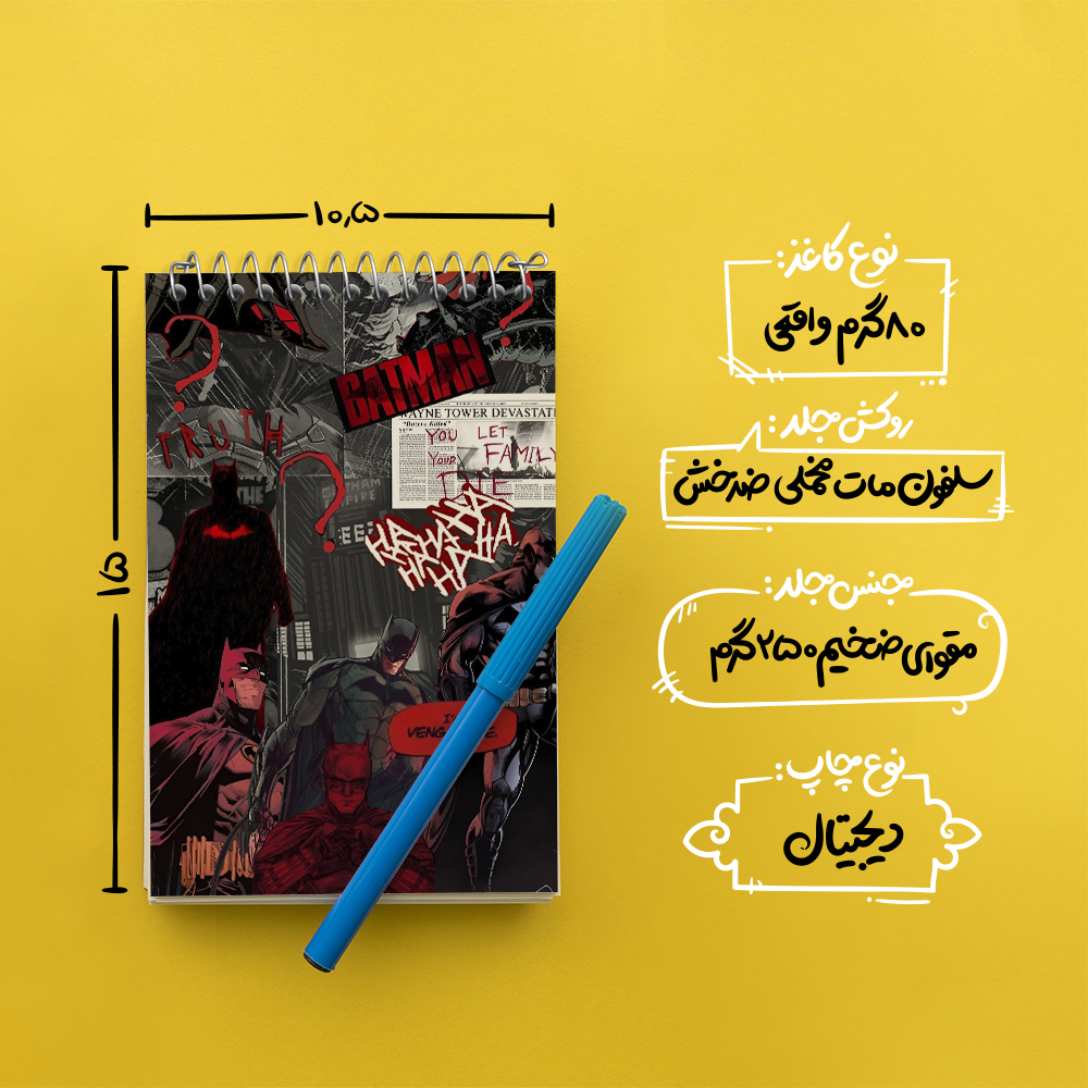 برند خندالو در زمینه تولید انواع دفاتر فانتزی و تحصیلی فعالیت میکند که به دلیل جذابیت ظاهری و طرح های متنوع طرفداران زیادی دارد. دفتر یادداشت خندالو طرح بتمن (Batman) محصولی مناسب برای همه عاشقان لوازم التحریر است و همچنین همه کسانی که بنا به موقعیت تحصیل یا شغلشان با دفتر و نوشت افزار زیاد سر و کار دارند. در تولید دفتر یادداشت خندالو طرح بتمن (Batman) از نوع صحافی فنر مارپیچ استفاده شده که در این نوع صحافی برگه‌ها به راحتی چرخیده و یا بیرون آورده می شوند.