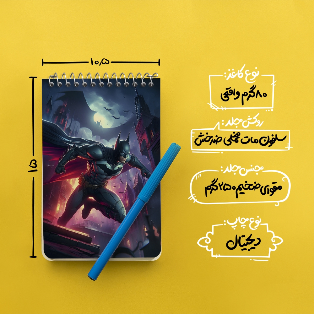 برند خندالو در زمینه تولید انواع دفاتر فانتزی و تحصیلی فعالیت میکند که به دلیل جذابیت ظاهری و طرح های متنوع طرفداران زیادی دارد. دفتر یادداشت خندالو طرح بتمن (Batman) محصولی مناسب برای همه عاشقان لوازم التحریر است و همچنین همه کسانی که بنا به موقعیت تحصیل یا شغلشان با دفتر و نوشت افزار زیاد سر و کار دارند. در تولید دفتر یادداشت خندالو طرح بتمن (Batman) از نوع صحافی فنر مارپیچ استفاده شده که در این نوع صحافی برگه‌ها به راحتی چرخیده و یا بیرون آورده می شوند.