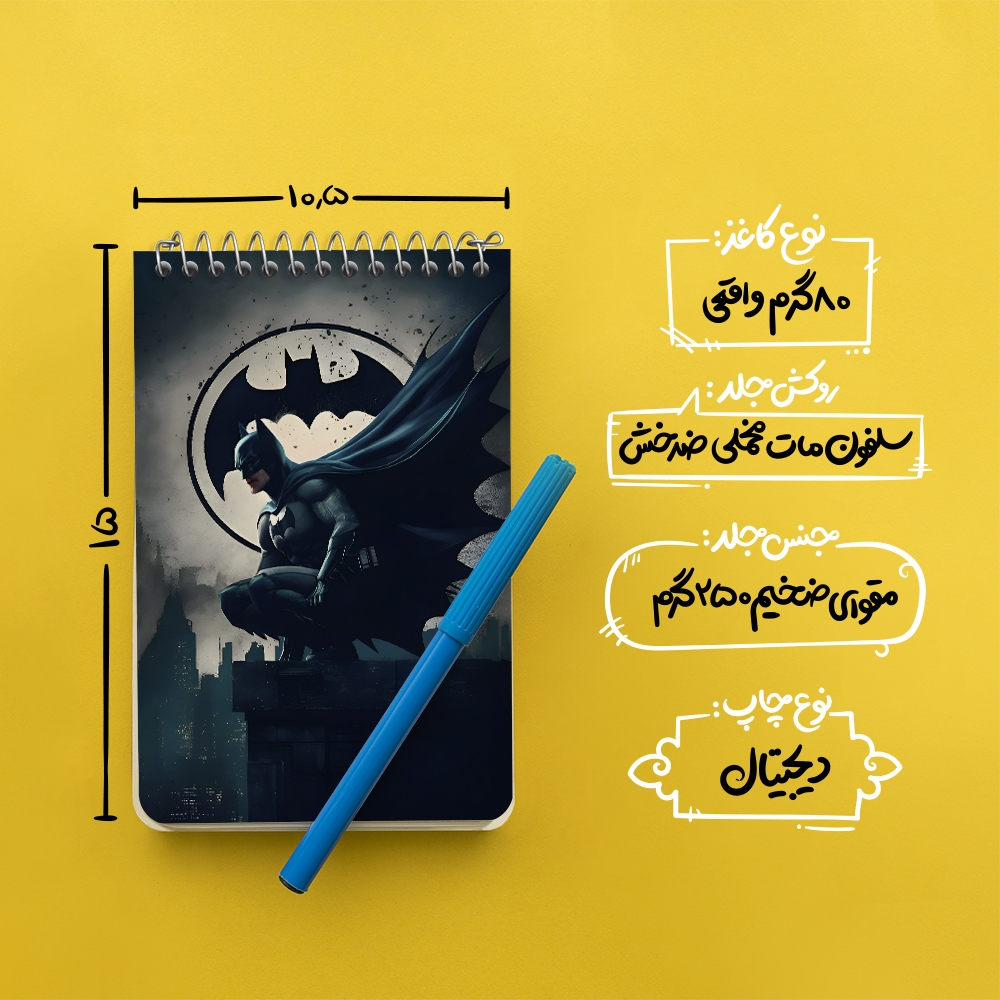 برند خندالو در زمینه تولید انواع دفاتر فانتزی و تحصیلی فعالیت میکند که به دلیل جذابیت ظاهری و طرح های متنوع طرفداران زیادی دارد. دفتر یادداشت خندالو طرح بتمن (Batman) محصولی مناسب برای همه عاشقان لوازم التحریر است و همچنین همه کسانی که بنا به موقعیت تحصیل یا شغلشان با دفتر و نوشت افزار زیاد سر و کار دارند. در تولید دفتر یادداشت خندالو طرح بتمن (Batman) از نوع صحافی فنر مارپیچ استفاده شده که در این نوع صحافی برگه‌ها به راحتی چرخیده و یا بیرون آورده می شوند.
