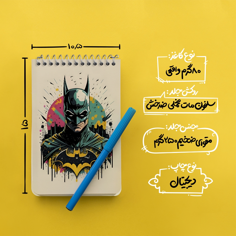 برند خندالو در زمینه تولید انواع دفاتر فانتزی و تحصیلی فعالیت میکند که به دلیل جذابیت ظاهری و طرح های متنوع طرفداران زیادی دارد. دفتر یادداشت خندالو طرح بتمن (Batman) محصولی مناسب برای همه عاشقان لوازم التحریر است و همچنین همه کسانی که بنا به موقعیت تحصیل یا شغلشان با دفتر و نوشت افزار زیاد سر و کار دارند. در تولید دفتر یادداشت خندالو طرح بتمن (Batman) از نوع صحافی فنر مارپیچ استفاده شده که در این نوع صحافی برگه‌ها به راحتی چرخیده و یا بیرون آورده می شوند.