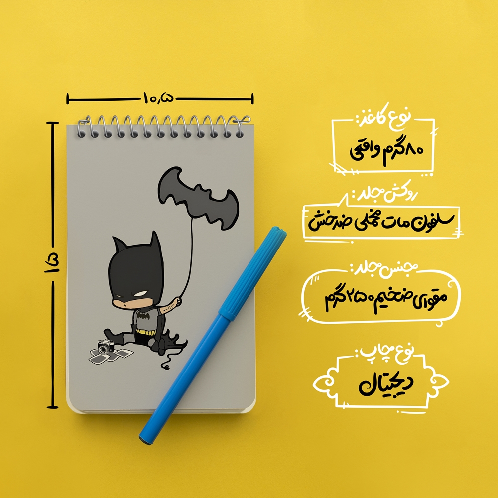 برند خندالو در زمینه تولید انواع دفاتر فانتزی و تحصیلی فعالیت میکند که به دلیل جذابیت ظاهری و طرح های متنوع طرفداران زیادی دارد. دفتر یادداشت خندالو طرح بتمن (Batman) محصولی مناسب برای همه عاشقان لوازم التحریر است و همچنین همه کسانی که بنا به موقعیت تحصیل یا شغلشان با دفتر و نوشت افزار زیاد سر و کار دارند. در تولید دفتر یادداشت خندالو طرح بتمن (Batman) از نوع صحافی فنر مارپیچ استفاده شده که در این نوع صحافی برگه‌ها به راحتی چرخیده و یا بیرون آورده می شوند.