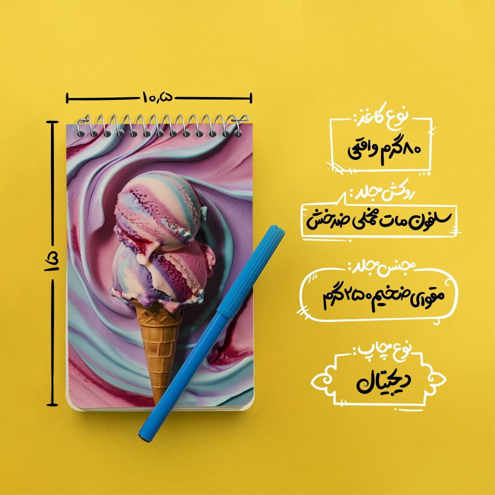 برند خندالو در زمینه تولید انواع دفاتر فانتزی و تحصیلی فعالیت میکند که به دلیل جذابیت ظاهری و طرح های متنوع طرفداران زیادی دارد. دفتر یادداشت خندالو طرح بستنی قیفی محصولی مناسب برای همه عاشقان لوازم التحریر است و همچنین همه کسانی که بنا به موقعیت تحصیل یا شغلشان با دفتر و نوشت افزار زیاد سر و کار دارند. در تولید دفتر یادداشت خندالو طرح بستنی قیفی از نوع صحافی فنر مارپیچ استفاده شده که در این نوع صحافی برگهها به راحتی چرخیده و یا بیرون آورده می شوند. دفتر های خندالو دارای جلد انعطاف پذیر از جنس مقوای گلاسه 250 گرم با روکش سلفون مات مخملی است که به شما امکان میدهد از دفتر خود بدون اینکه نگرانی از شکستن یا خراب شدن جلد را داشته باشید استفاده کنید و همچنین در این دفاتر از کاغذ 80 گرم با کیفیت استفاده شده که باعث میشود هنگام نوشتن به خوبی جوهر قلم بر روی صفحه نشسته و از خط خوردگیها جلوگیری کند. دفتر یادداشت خندالو با جنس و دوام مناسب، برگه های کاملاً سفید و خطوط طوسی دقیق را داراست که انسان را به نوشتن منظم و زیبا ترغیب میکند. طراحی کاملاً مناسب این دفاتر، به همراه کیفیت بالا، از آن یک محصول مورد علاقه و قابل اعتماد برای همه مقاطع تحصیلی میسازد. دفتر یادداشت خندالو طرح بستنی قیفی انتخابی هوشمندانه و مناسب برای افرادی است که به دنبال دفتری با کیفیت و کاربرد عالی هستند. این دفتر، همراه خوبی برای شما در تمام مراحل تحصیل و کار خواهد بود و تجربهای لذتبخش از نوشتن و آموختن را به شما هدیه میدهد.