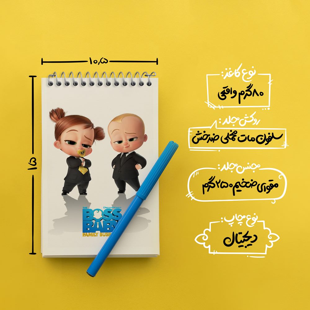 برند خندالو در زمینه تولید انواع دفاتر فانتزی و تحصیلی فعالیت میکند که به دلیل جذابیت ظاهری و طرح های متنوع طرفداران زیادی دارد. دفتر یادداشت خندالو طرح بچه رئیس Boss Baby محصولی مناسب برای همه عاشقان لوازم التحریر است و همچنین همه کسانی که بنا به موقعیت تحصیل یا شغلشان با دفتر و نوشت افزار زیاد سر و کار دارند. در تولید دفتر یادداشت خندالو طرح بچه رئیس Boss Baby از نوع صحافی فنر مارپیچ استفاده شده که در این نوع صحافی برگه‌ها به راحتی چرخیده و یا بیرون آورده می شوند.