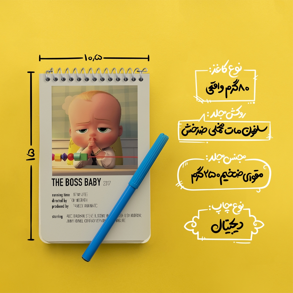 برند خندالو در زمینه تولید انواع دفاتر فانتزی و تحصیلی فعالیت میکند که به دلیل جذابیت ظاهری و طرح های متنوع طرفداران زیادی دارد. دفتر یادداشت خندالو طرح بچه رئیس (The Boss Baby) محصولی مناسب برای همه عاشقان لوازم التحریر است و همچنین همه کسانی که بنا به موقعیت تحصیل یا شغلشان با دفتر و نوشت افزار زیاد سر و کار دارند. در تولید دفتر یادداشت خندالو طرح بچه رئیس (The Boss Baby) از نوع صحافی فنر مارپیچ استفاده شده که در این نوع صحافی برگهها به راحتی چرخیده و یا بیرون آورده می شوند. دفتر های خندالو دارای جلد انعطاف پذیر از جنس مقوای گلاسه 250 گرم با روکش سلفون مات مخملی است که به شما امکان میدهد از دفتر خود بدون اینکه نگرانی از شکستن یا خراب شدن جلد را داشته باشید استفاده کنید و همچنین در این دفاتر از کاغذ 80 گرم با کیفیت استفاده شده که باعث میشود هنگام نوشتن به خوبی جوهر قلم بر روی صفحه نشسته و از خط خوردگیها جلوگیری کند. دفتر یادداشت خندالو با جنس و دوام مناسب، برگه های کاملاً سفید و خطوط طوسی دقیق را داراست که انسان را به نوشتن منظم و زیبا ترغیب میکند. طراحی کاملاً مناسب این دفاتر، به همراه کیفیت بالا، از آن یک محصول مورد علاقه و قابل اعتماد برای همه مقاطع تحصیلی میسازد. دفتر یادداشت خندالو طرح بچه رئیس (The Boss Baby) انتخابی هوشمندانه و مناسب برای افرادی است که به دنبال دفتری با کیفیت و کاربرد عالی هستند. این دفتر، همراه خوبی برای شما در تمام مراحل تحصیل و کار خواهد بود و تجربهای لذتبخش از نوشتن و آموختن را به شما هدیه میدهد.