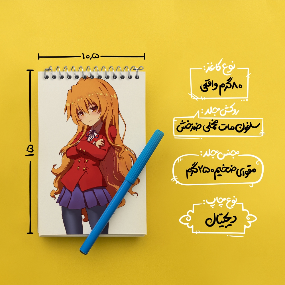 برند خندالو در زمینه تولید انواع دفاتر فانتزی و تحصیلی فعالیت میکند که به دلیل جذابیت ظاهری و طرح های متنوع طرفداران زیادی دارد. دفتر یادداشت خندالو طرح تایگا انیمه تورادورا محصولی مناسب برای همه عاشقان لوازم التحریر است و همچنین همه کسانی که بنا به موقعیت تحصیل یا شغلشان با دفتر و نوشت افزار زیاد سر و کار دارند. در تولید دفتر یادداشت خندالو طرح تایگا انیمه تورادورا از نوع صحافی فنر مارپیچ استفاده شده که در این نوع صحافی برگه‌ها به راحتی چرخیده و یا بیرون آورده می شوند.