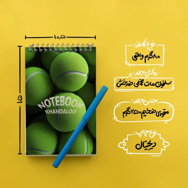 برند خندالو در زمینه تولید انواع دفاتر فانتزی و تحصیلی فعالیت میکند که به دلیل جذابیت ظاهری و طرح های متنوع طرفداران زیادی دارد. دفتر یادداشت خندالو طرح توپ تنیس محصولی مناسب برای همه عاشقان لوازم التحریر است و همچنین همه کسانی که بنا به موقعیت تحصیل یا شغلشان با دفتر و نوشت افزار زیاد سر و کار دارند. در تولید دفتر یادداشت خندالو طرح توپ تنیس از نوع صحافی فنر مارپیچ استفاده شده که در این نوع صحافی برگهها به راحتی چرخیده و یا بیرون آورده می شوند. دفتر های خندالو دارای جلد انعطاف پذیر از جنس مقوای گلاسه 250 گرم با روکش سلفون مات مخملی است که به شما امکان میدهد از دفتر خود بدون اینکه نگرانی از شکستن یا خراب شدن جلد را داشته باشید استفاده کنید و همچنین در این دفاتر از کاغذ 80 گرم با کیفیت استفاده شده که باعث میشود هنگام نوشتن به خوبی جوهر قلم بر روی صفحه نشسته و از خط خوردگیها جلوگیری کند. دفتر یادداشت خندالو با جنس و دوام مناسب، برگه های کاملاً سفید و خطوط طوسی دقیق را داراست که انسان را به نوشتن منظم و زیبا ترغیب میکند. طراحی کاملاً مناسب این دفاتر، به همراه کیفیت بالا، از آن یک محصول مورد علاقه و قابل اعتماد برای همه مقاطع تحصیلی میسازد. دفتر یادداشت خندالو طرح توپ تنیس انتخابی هوشمندانه و مناسب برای افرادی است که به دنبال دفتری با کیفیت و کاربرد عالی هستند. این دفتر، همراه خوبی برای شما در تمام مراحل تحصیل و کار خواهد بود و تجربهای لذتبخش از نوشتن و آموختن را به شما هدیه میدهد.