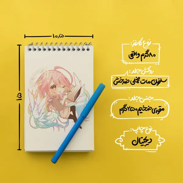 برند خندالو در زمینه تولید انواع دفاتر فانتزی و تحصیلی فعالیت میکند که به دلیل جذابیت ظاهری و طرح های متنوع طرفداران زیادی دارد. دفتر یادداشت خندالو طرح جیبریل انیمه نو گیم نو لایف محصولی مناسب برای همه عاشقان لوازم التحریر است و همچنین همه کسانی که بنا به موقعیت تحصیل یا شغلشان با دفتر و نوشت افزار زیاد سر و کار دارند. در تولید دفتر یادداشت خندالو طرح جیبریل انیمه نو گیم نو لایف از نوع صحافی فنر مارپیچ استفاده شده که در این نوع صحافی برگهها به راحتی چرخیده و یا بیرون آورده می شوند. دفتر های خندالو دارای جلد انعطاف پذیر از جنس مقوای گلاسه 250 گرم با روکش سلفون مات مخملی است که به شما امکان میدهد از دفتر خود بدون اینکه نگرانی از شکستن یا خراب شدن جلد را داشته باشید استفاده کنید و همچنین در این دفاتر از کاغذ 80 گرم با کیفیت استفاده شده که باعث میشود هنگام نوشتن به خوبی جوهر قلم بر روی صفحه نشسته و از خط خوردگیها جلوگیری کند. دفتر یادداشت خندالو با جنس و دوام مناسب، برگه های کاملاً سفید و خطوط طوسی دقیق را داراست که انسان را به نوشتن منظم و زیبا ترغیب میکند. طراحی کاملاً مناسب این دفاتر، به همراه کیفیت بالا، از آن یک محصول مورد علاقه و قابل اعتماد برای همه مقاطع تحصیلی میسازد. دفتر یادداشت خندالو طرح جیبریل انیمه نو گیم نو لایف انتخابی هوشمندانه و مناسب برای افرادی است که به دنبال دفتری با کیفیت و کاربرد عالی هستند. این دفتر، همراه خوبی برای شما در تمام مراحل تحصیل و کار خواهد بود و تجربهای لذتبخش از نوشتن و آموختن را به شما هدیه میدهد.