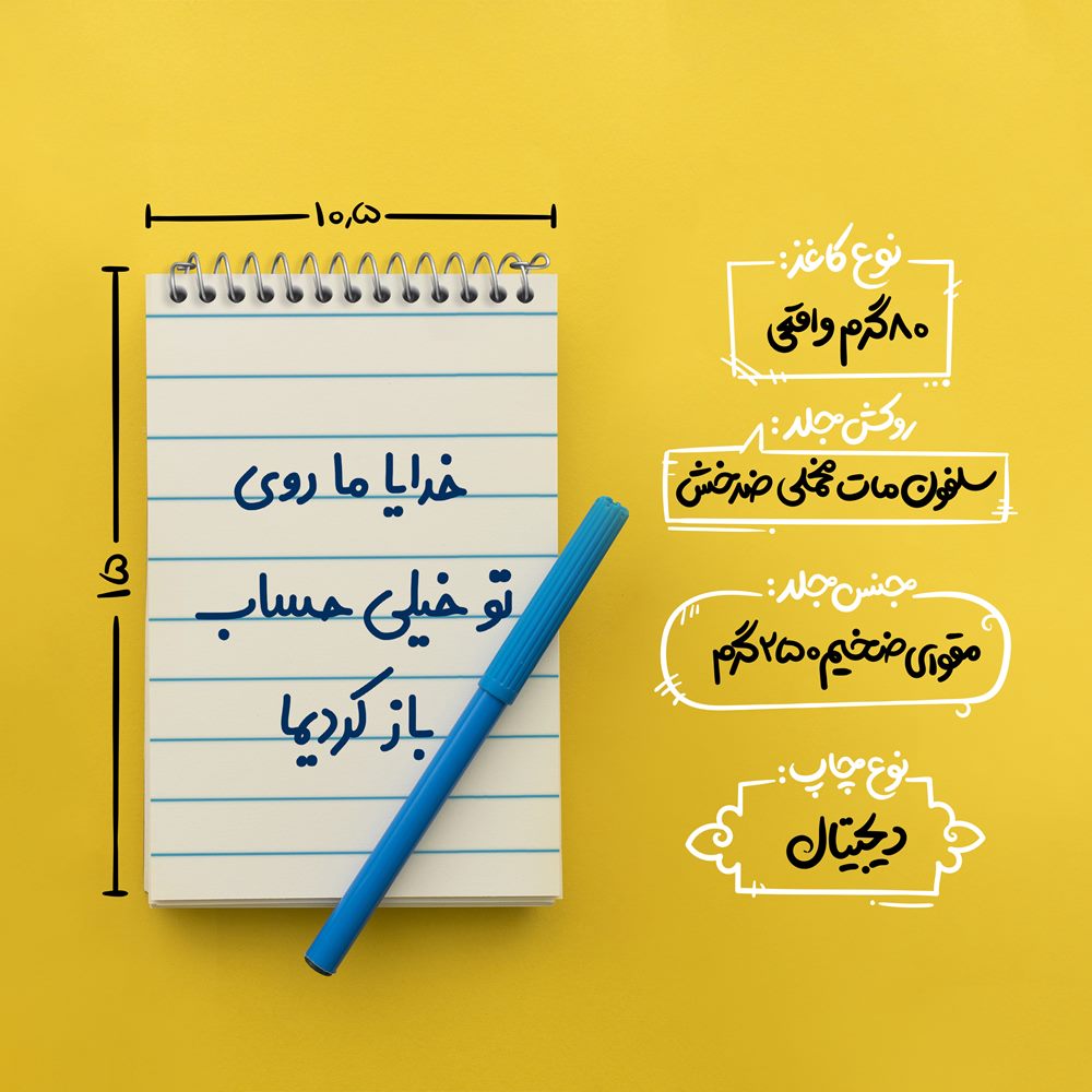 برند خندالو در زمینه تولید انواع دفاتر فانتزی و تحصیلی فعالیت میکند که به دلیل جذابیت ظاهری و طرح های متنوع طرفداران زیادی دارد. دفتر یادداشت خندالو طرح خدایا ما روی تو خیلی حساب باز کردیما محصولی مناسب برای همه عاشقان لوازم التحریر است و همچنین همه کسانی که بنا به موقعیت تحصیل یا شغلشان با دفتر و نوشت افزار زیاد سر و کار دارند. در تولید دفتر یادداشت خندالو طرح خدایا ما روی تو خیلی حساب باز کردیما از نوع صحافی فنر مارپیچ استفاده شده که در این نوع صحافی برگهها به راحتی چرخیده و یا بیرون آورده می شوند. دفتر های خندالو دارای جلد انعطاف پذیر از جنس مقوای گلاسه 250 گرم با روکش سلفون مات مخملی است که به شما امکان میدهد از دفتر خود بدون اینکه نگرانی از شکستن یا خراب شدن جلد را داشته باشید استفاده کنید و همچنین در این دفاتر از کاغذ 80 گرم با کیفیت استفاده شده که باعث میشود هنگام نوشتن به خوبی جوهر قلم بر روی صفحه نشسته و از خط خوردگیها جلوگیری کند. دفتر یادداشت خندالو با جنس و دوام مناسب، برگه های کاملاً سفید و خطوط طوسی دقیق را داراست که انسان را به نوشتن منظم و زیبا ترغیب میکند. طراحی کاملاً مناسب این دفاتر، به همراه کیفیت بالا، از آن یک محصول مورد علاقه و قابل اعتماد برای همه مقاطع تحصیلی میسازد. دفتر یادداشت خندالو طرح خدایا ما روی تو خیلی حساب باز کردیما انتخابی هوشمندانه و مناسب برای افرادی است که به دنبال دفتری با کیفیت و کاربرد عالی هستند. این دفتر، همراه خوبی برای شما در تمام مراحل تحصیل و کار خواهد بود و تجربهای لذتبخش از نوشتن و آموختن را به شما هدیه میدهد.