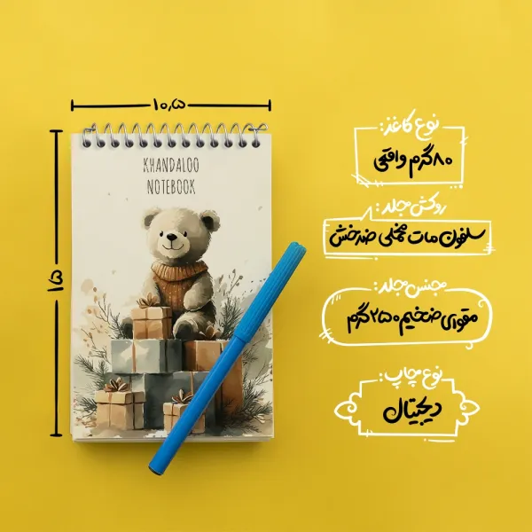 برند خندالو در زمینه تولید انواع دفاتر فانتزی و تحصیلی فعالیت میکند که به دلیل جذابیت ظاهری و طرح های متنوع طرفداران زیادی دارد. دفتر یادداشت خندالو طرح خرس کیوت محصولی مناسب برای همه عاشقان لوازم التحریر است و همچنین همه کسانی که بنا به موقعیت تحصیل یا شغلشان با دفتر و نوشت افزار زیاد سر و کار دارند. در تولید دفتر یادداشت خندالو طرح خرس کیوت از نوع صحافی فنر مارپیچ استفاده شده که در این نوع صحافی برگه‌ها به راحتی چرخیده و یا بیرون آورده می شوند.