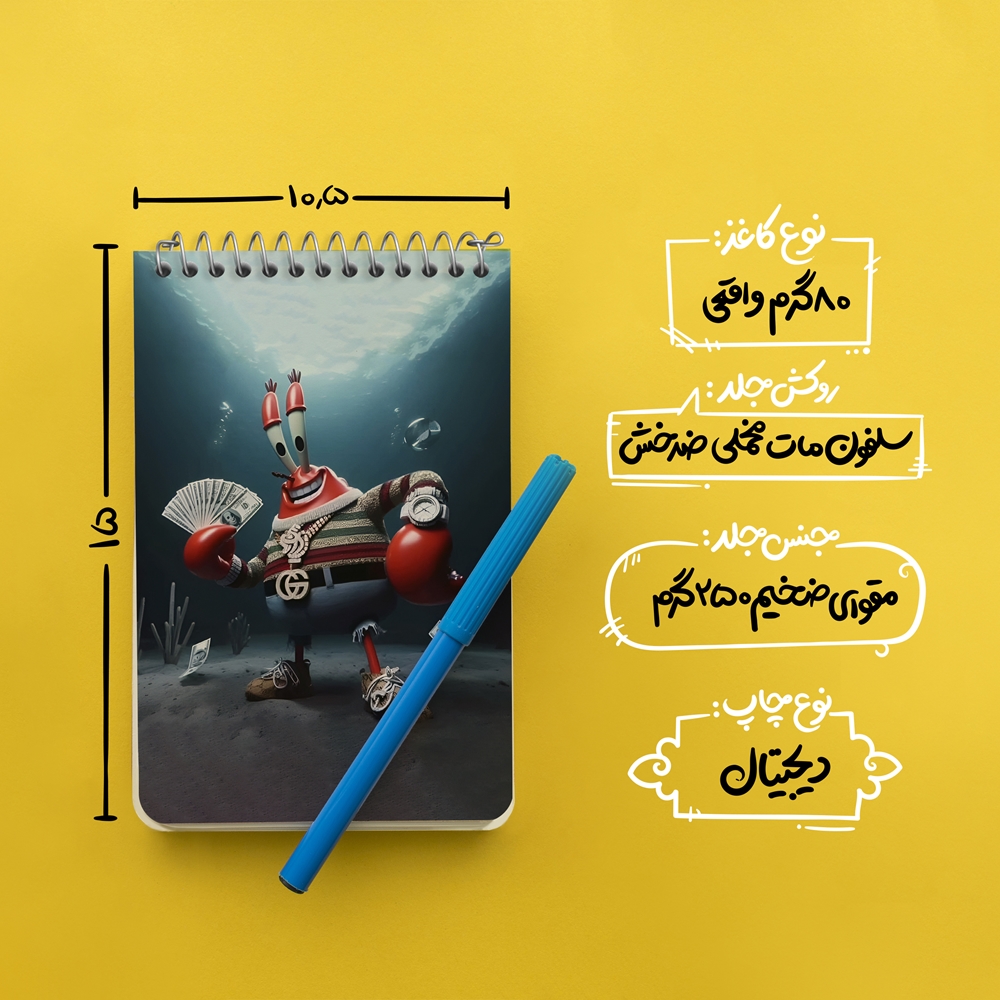 برند خندالو در زمینه تولید انواع دفاتر فانتزی و تحصیلی فعالیت میکند که به دلیل جذابیت ظاهری و طرح های متنوع طرفداران زیادی دارد. دفتر یادداشت خندالو طرح خرچنگ باب اسفنجی محصولی مناسب برای همه عاشقان لوازم التحریر است و همچنین همه کسانی که بنا به موقعیت تحصیل یا شغلشان با دفتر و نوشت افزار زیاد سر و کار دارند. در تولید دفتر یادداشت خندالو طرح خرچنگ باب اسفنجی از نوع صحافی فنر مارپیچ استفاده شده که در این نوع صحافی برگه‌ها به راحتی چرخیده و یا بیرون آورده می شوند.